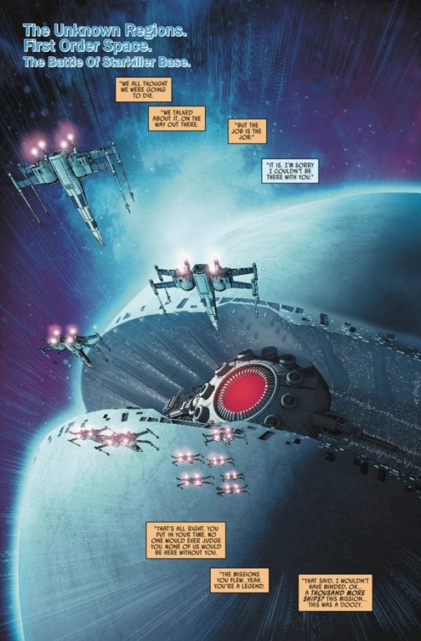 The first nine pages of Poe Dameron 28 are a surface retelling of the battle of Starkiller base from a slightly different perspective than our heroes on the ground in the Force Awakens. Unzueta picked up artistic duties in issue 14 and, while I personally find Noto’s style preferable, Unzueta has been doing a fantastic job. Keeping my opinions limited to issue 28, his epic depictions of space battles don’t skimp on details and give us Star Wars fans that tried and true sense of galactic scale. Unzueta’s space-borne Battle of Starkiller Base is played out across four double-page spreads which economic use of the space provided without robbing the reader of the details. Unzueta is stronger on technology than depictions of human faces, but nobody’s complaining with what Larocca is doing over on the main Star Wars series. Prianto’s aide on colors makes Unzueta’s art vividly pop with bright purples and blues set against the black vacuum of space.