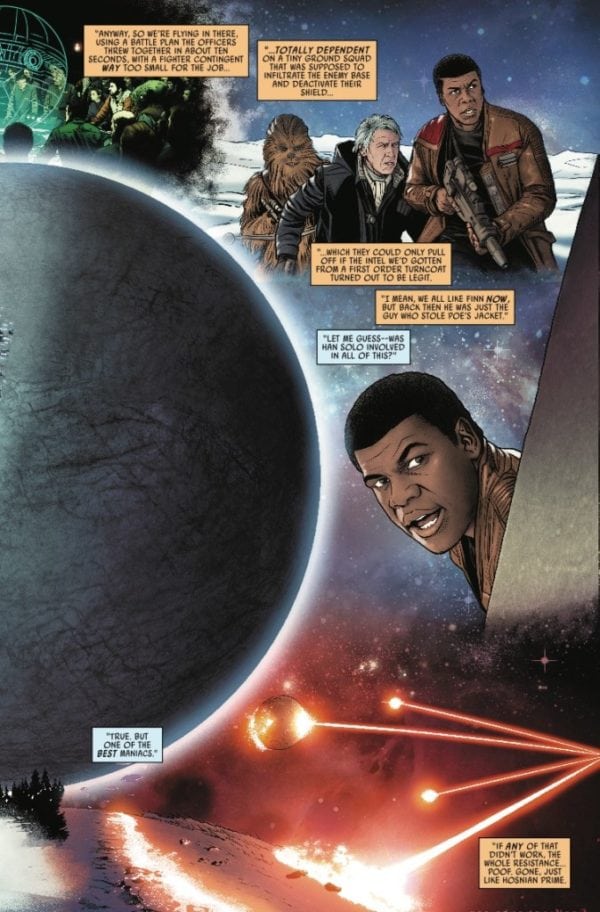 Some readers may be quicker on the draw than I, but when the narrators are finally revealed, you get an “a-ha!” moment. However, the novelty of BB-8 re-telling the battle of Starkiller Base to R2 who missed out on the action wears off quick. You are then left with the fact that the first nine pages still provided little new information to the film’s story.