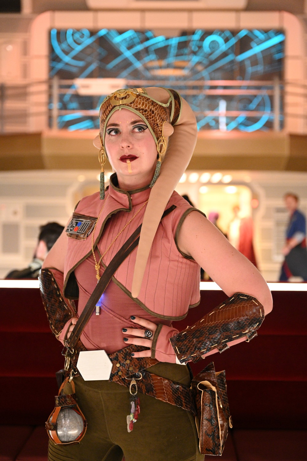 We were on the penultimate voyage, which was obviously sold out and also had a huge number of repeat voyagers on it, so the number of people in cosplay or at least world-appropriate bounds was probably at over 95%. I went with my parents and sister – the trip was a very belated birthday present that I’d been planning for over two years – we were originally signed up for an October cosplay-only sailing before the cancellation ruined our plans, but thankfully we were able to rebook. I am the only cosplayer and wanted us to go all-out so I put together fourteen outfits for the four of us – this summer was a LOT of sewing, but it was worth it. We had a family backstory – my parents were a former senator turned mayor of Hanna City and her husband a somewhat corrupt “merchant”-cum-smuggler, I was the Twi’lek owner of a chain of core-world cantinas wanting to rope Gaya in for a residency, and my sister was a resistance agent.