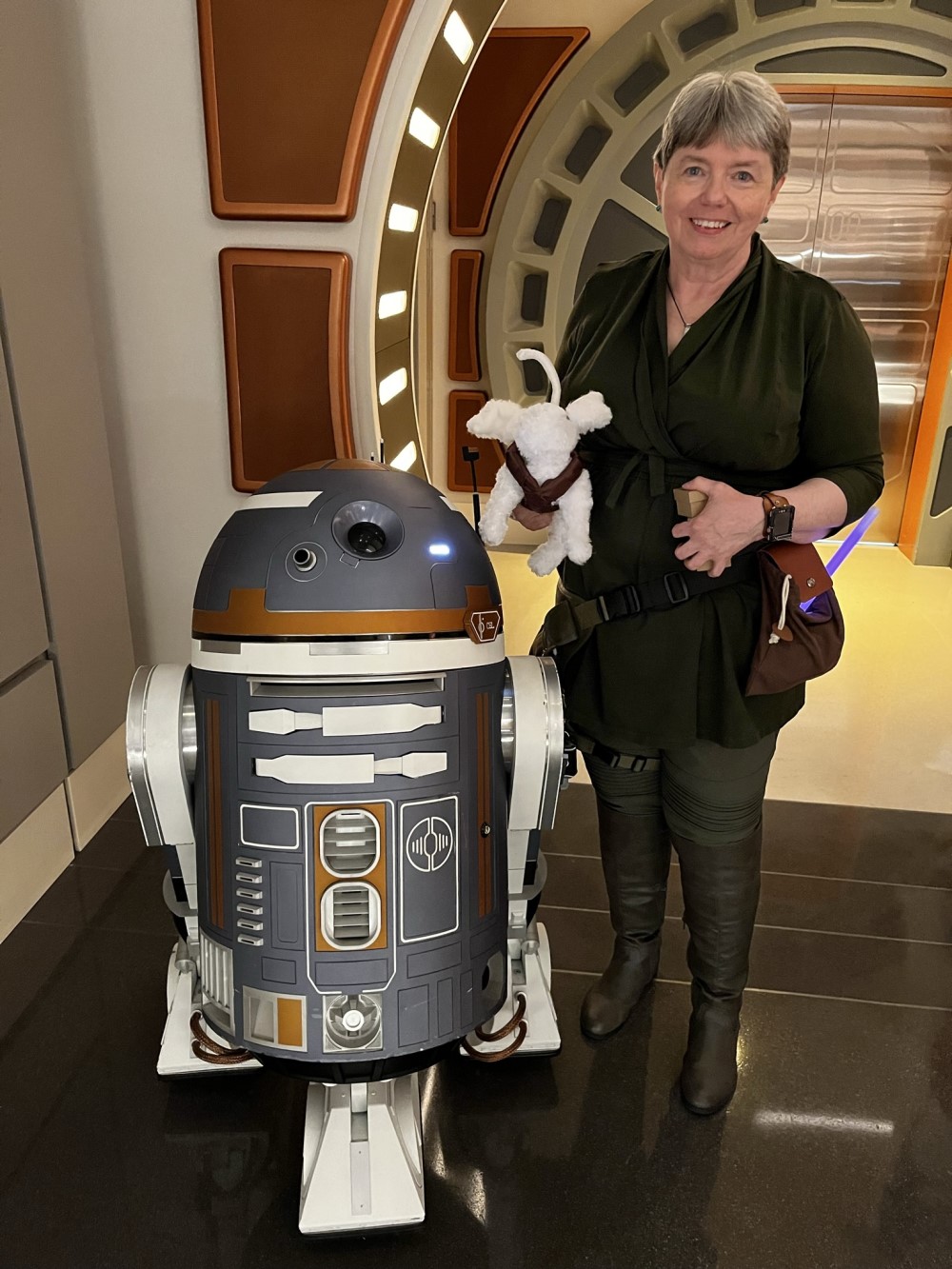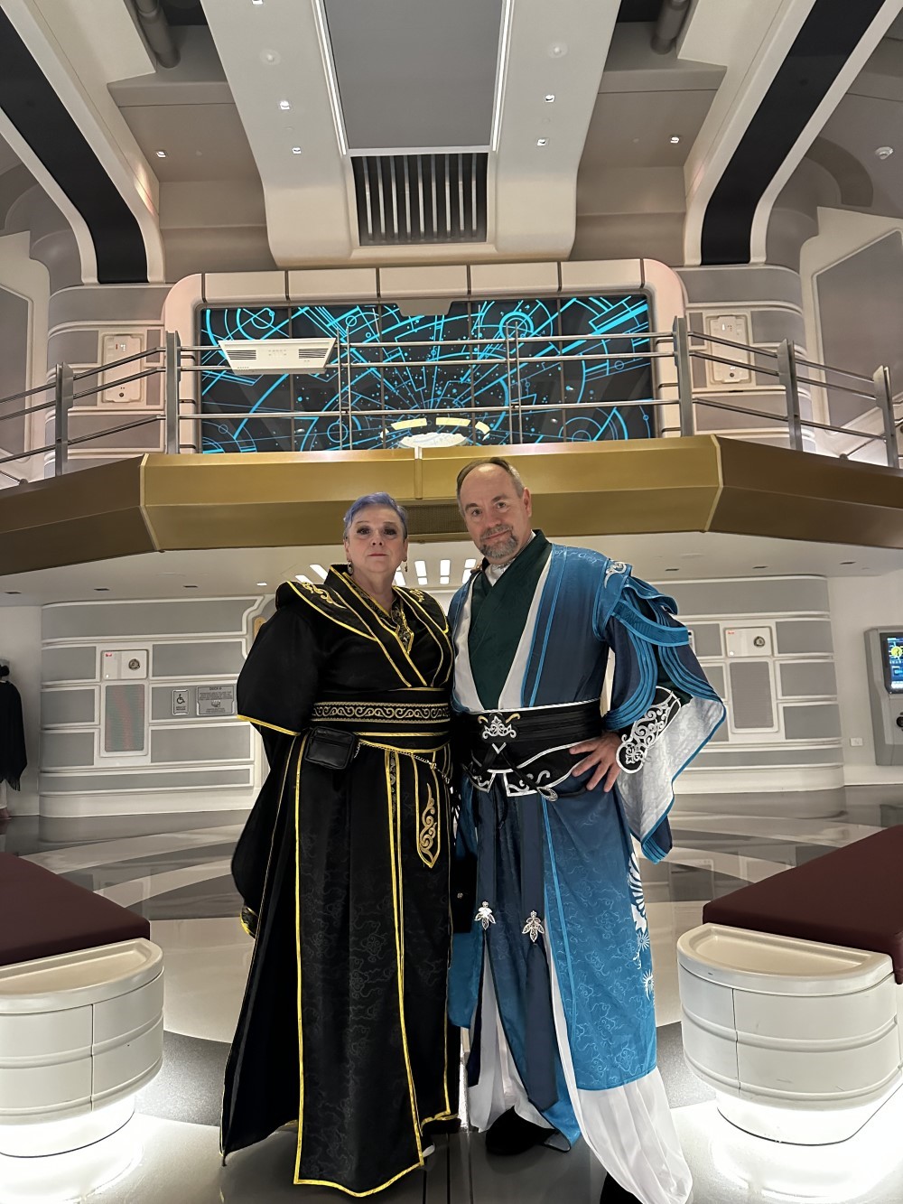 My husband Bryon and I went on two cruises. He played Reynard Husheng, who was a 300-year old Jedi master Huli Jing AND the master thief/avenger of the High Republic who time traveled the old fashioned way, via being frozen in Carbonite. I played Eden Arborlane, ex-Padawan who accessed the World Between Worlds and tried to reinstate the philosophies of her master, and then after Order 66, lifted Jedi and Sith artifacts from the Coruscant Temple. Eden now works as a fashion designer and her time in the World Between Worlds has turned her into a Force prophet.