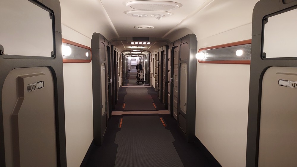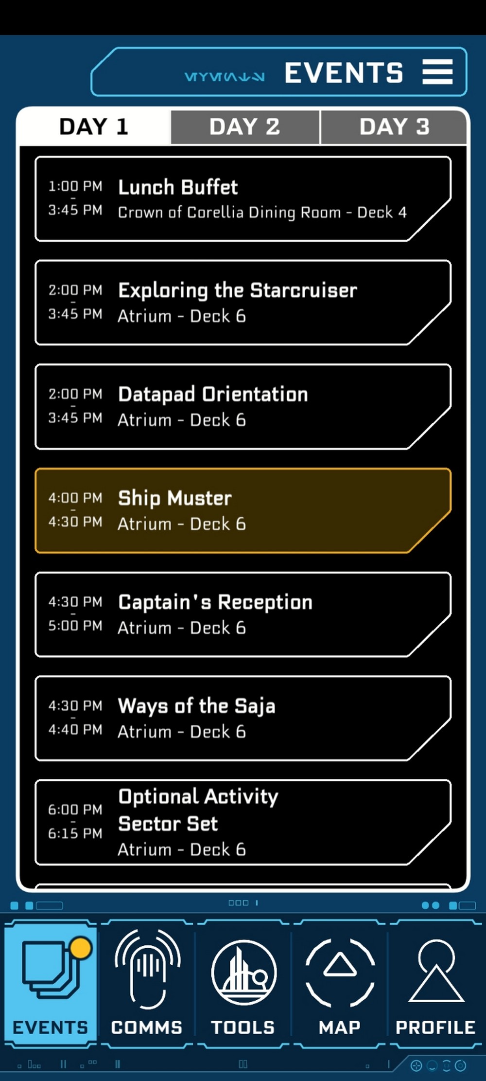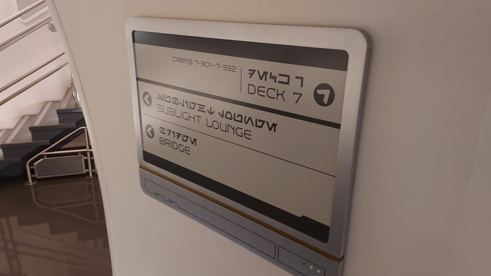 Our cabin was located on Deck 7, cabin 327 (yes, like the platform) and inside were small but perfectly designed quarters that held everything you could need. A sizeable double bed sat in the center of the room, while 2 bunk beds were to the left. The window allowed a view of the outside, while a large screen faced the end of the bed. The bathroom held a shower large enough for 2, and a screen allowed the head of ship logistics D3-O9 to update the traveller and answer questions. So clever, and another level of immersion that kept you in the zone from waking up first thing to dozing off late at night.