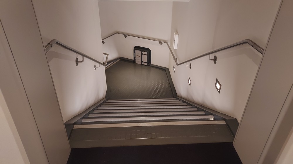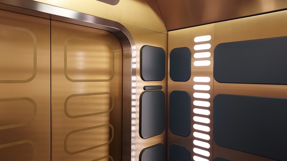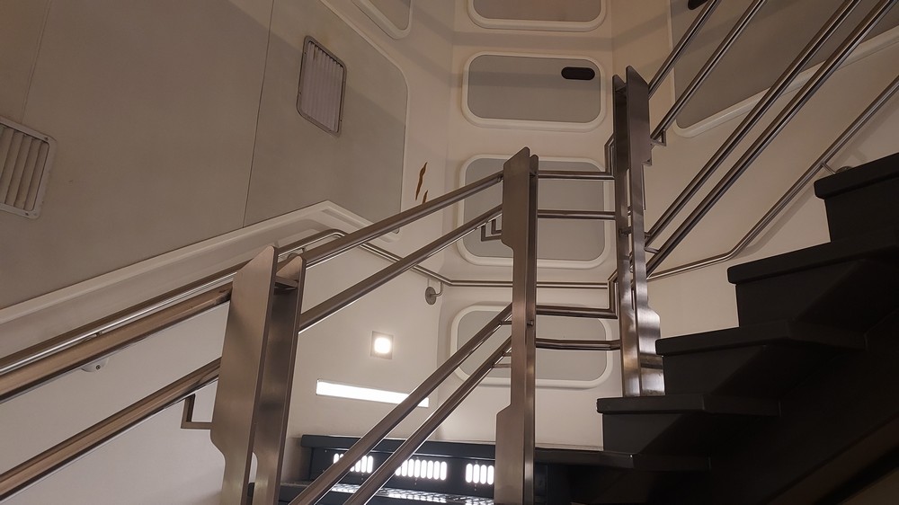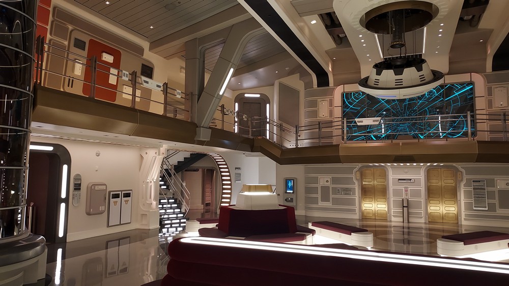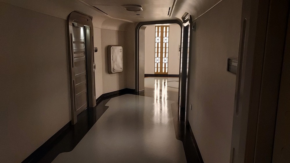 Running around the top of the Atrium is a Mezzanine level, where the crew, the droids and the climatic moments of the storyline take place, while the end of the Atrium opens into stairs heading down from Deck 6 to Decks 4 and 5 where the passenger cabins lie, or an elevator. You could happily walk the corridors, passing numerous rooms and cabins and a prominent map showing the layout of the 100-cabin Corellian MPO-1400 300 meter long Purrgil-Class Star Cruiser. Attentive eyes would spot a tiny doorway, the quarters of the Anzellan Shug Drabor who designed the ship, one of a number of easter eggs. Readers of the Halcyon Legacy comic would find even more, on the stairs heading up to the Mezzanine level and in engineering.