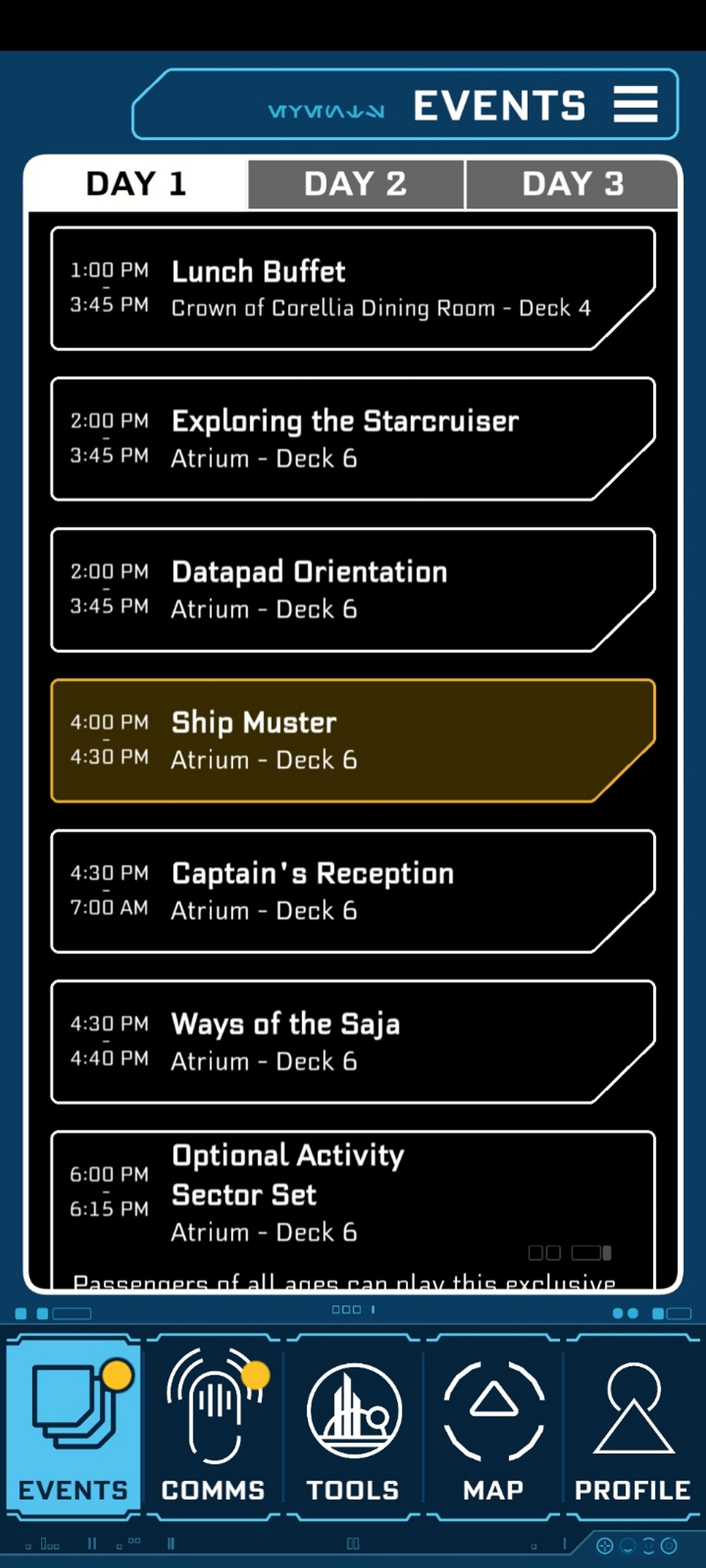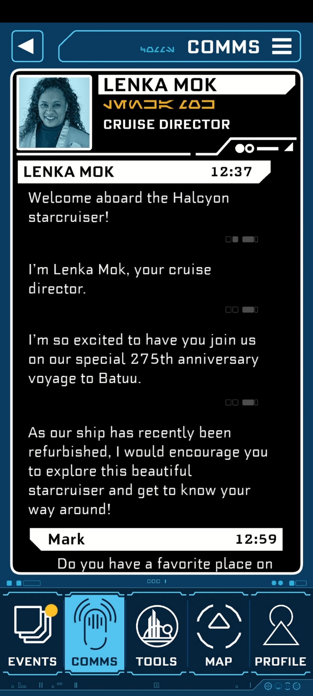 As in real life, we were glued to our phones, although in this reality it wasn’t Instagram, X or Facebook we were browsing but our datapads that kept us constantly updated with Events, Communications, Profiles and more. Events steered us towards meeting places and happenings while Communications saw the main members of the crew (Cruise Director Lenka Mok, Captain Keevan, First Order Lieutenant Croy, Gaya’s rouguish manager Raith Kole, Force teacher Saja and crew member Sammie) message us to ascertain our allegiances. Profiles showed how familiar we were with these characters, while the datapad gave us puzzles to solve (especially while off the ship down on Batuu and Black Spire Outpost). One sadness; once the voyage wasover, the datapad (part of the Play Disney app) reset. Thankfully, screenshots managed to save a few key moments.