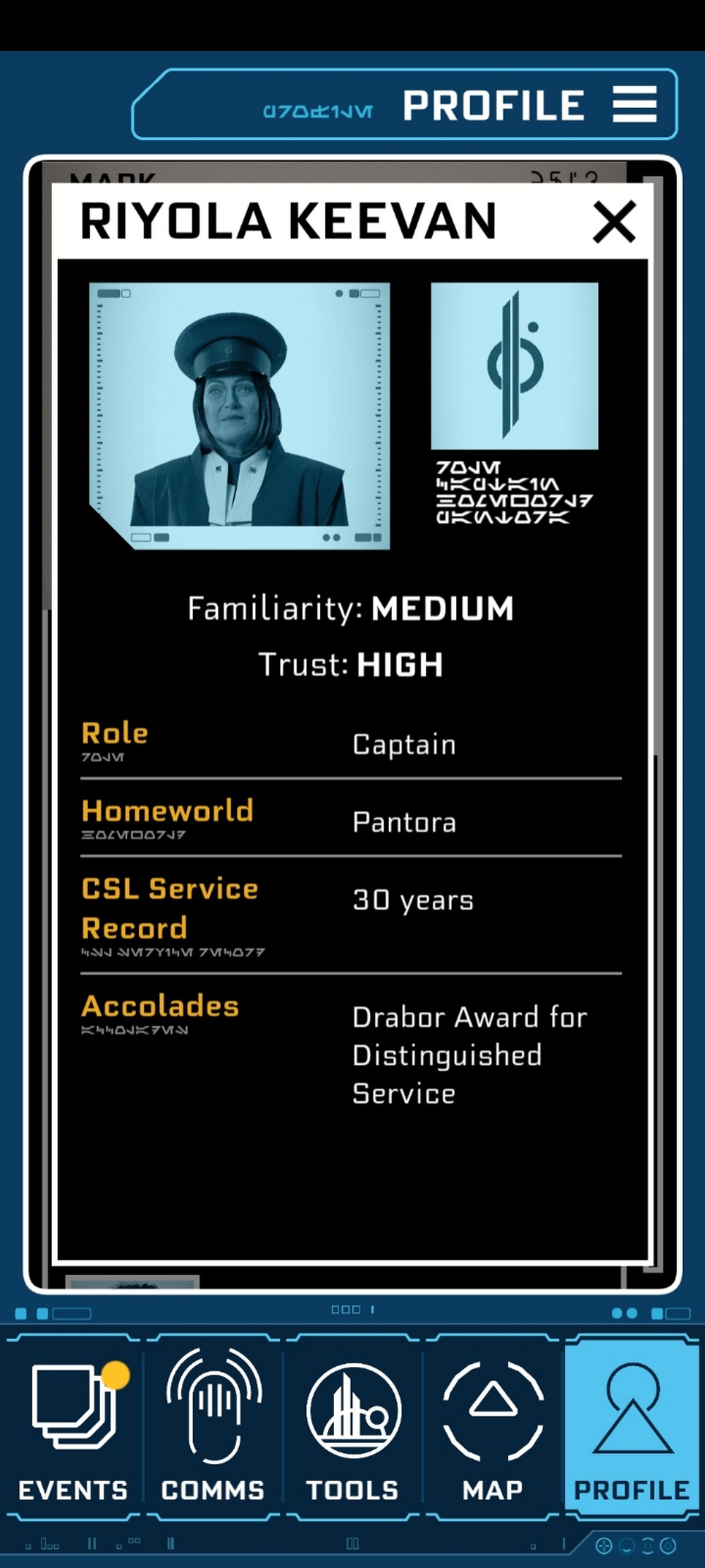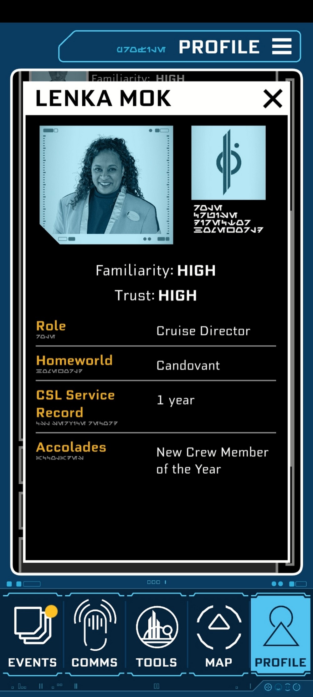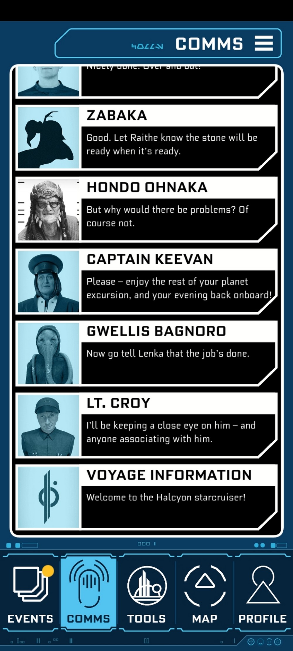 So we went. My character, Tansyn Rann, was a citizen of the planet Arbra. She and her lifemate ran a very successful business (“Outer Rim Artisans – bringing art from the Outer Rim to the Inner Worlds”), which we recently sold to a conglomerate for lots of credits. While my lifemate was looking to retire and pen the great galactic novel, I wanted an adventure. He gifted me with passage aboard the Halcyon.