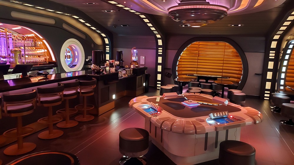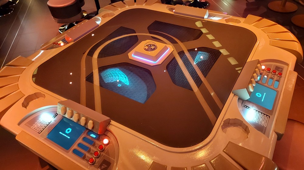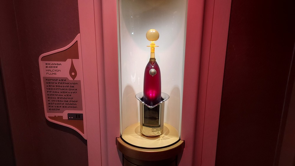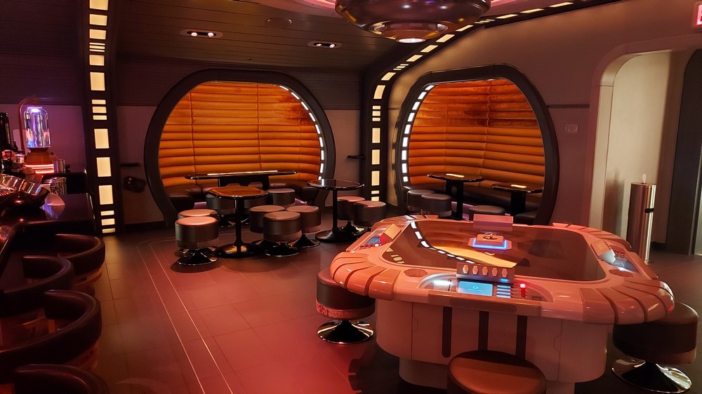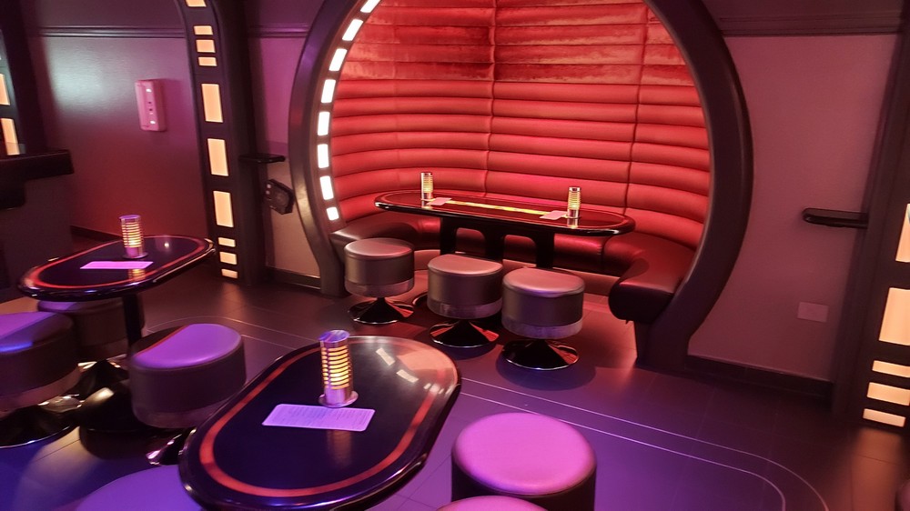 Walking clockwise around the Atrium takes you past a water station to the entrance to the Sublight Lounge. Opulent and beautifully lit, the Lounge serves the most incredible drinks (the Dagobah Vimlet was delicious, served in a beautiful glass while the Hoth Icebreaker was blue, fizzy fun). Want to learn to play sabacc? There’s a table in the center of the room which I played (badly, I’m not the best at games unlike my character the A-desandian free trader Jan Lomona) or booths to sit in and discuss the happenings on the ship, or life the universe and everything. It was here we conversed with Lieutenant Croy for 10 minutes as he tried to recruit us into the First Order, an interaction that was thrilling and very, very real.