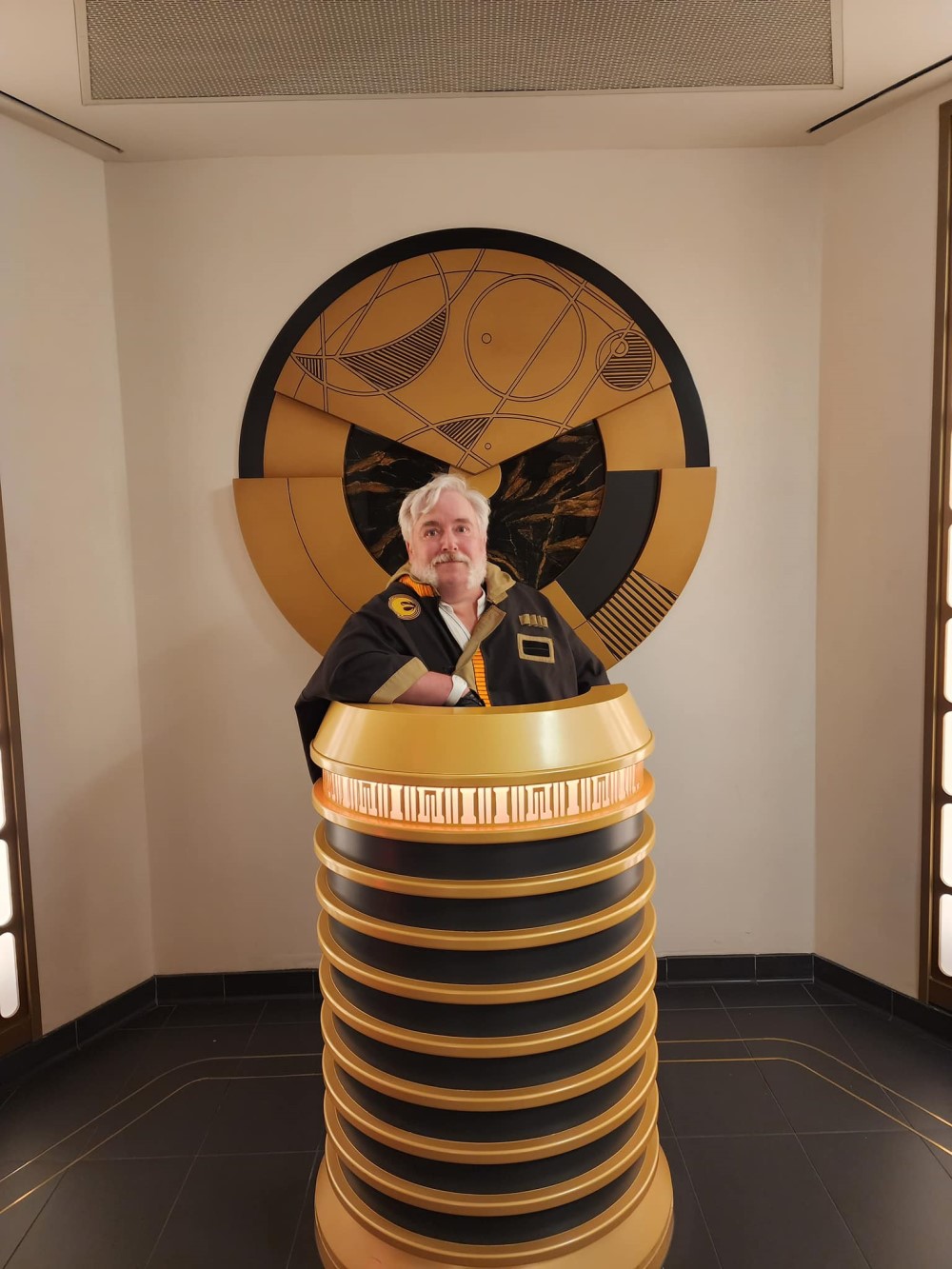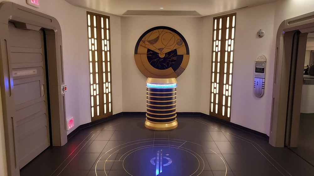 The shuttle takes off, the treeline disappears and with a flash we’re in hyperspace for a few moments, and then there she is…the Halcyon, hovering in front of us as we approach and dock in the hangar bay, familiar music from The Rise of Skywalker playing as the lights change and the doors open to reveal the interior of the ship. It’s breathtaking; art deco design, sleek and clean, the vast Atrium laid out before us as we walk out in wonder. The air is crisp, the Bridge to our left, the entrance to the Sublight Lounge ahead. We’re not immersed in the story quite yet, despite being ‘in character’ and wearing the appropriate clothing, but the scale of the room, the quality of the build and design and the smiles on everyones faces is instantly alluring.