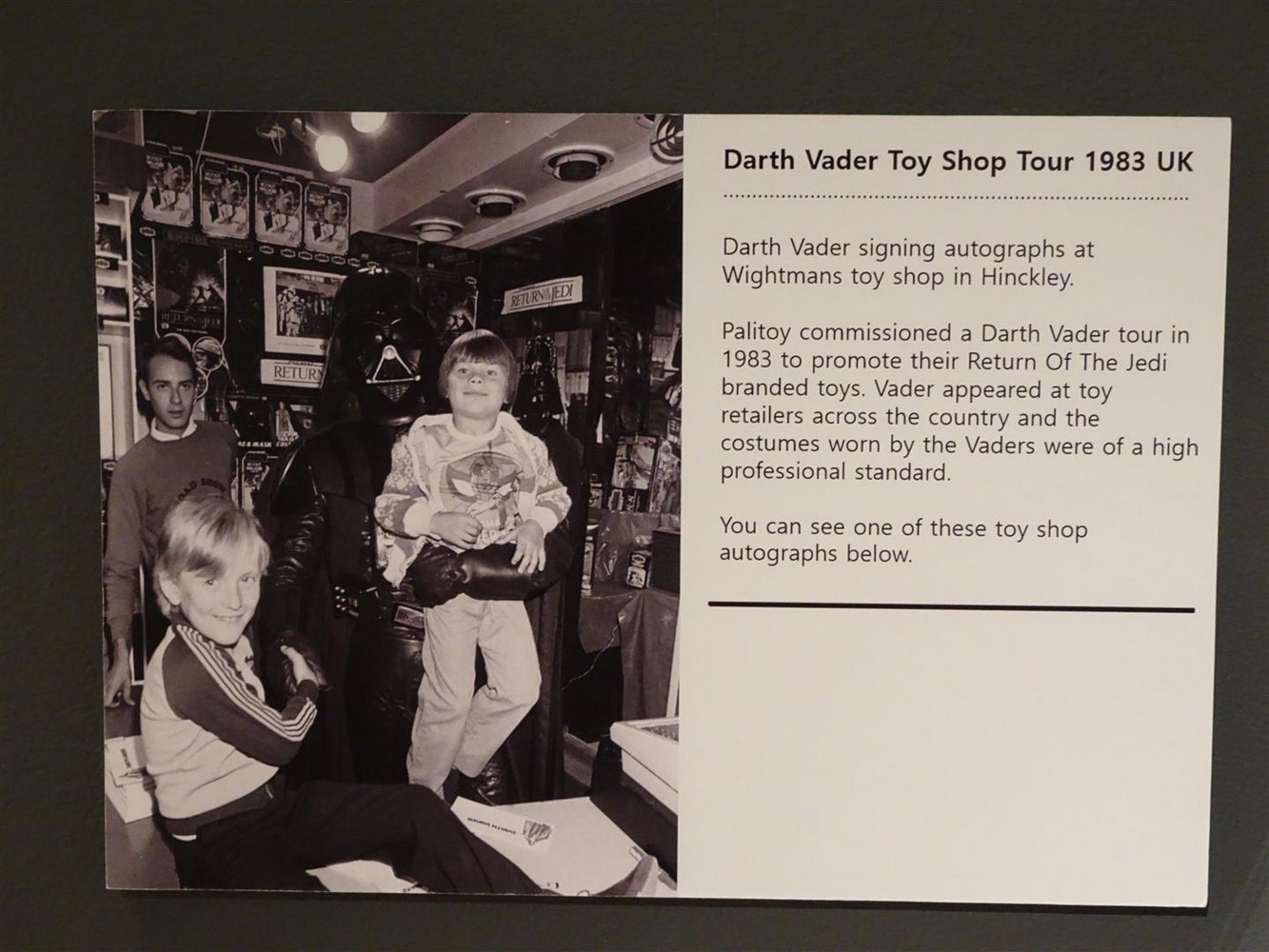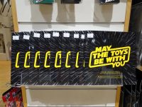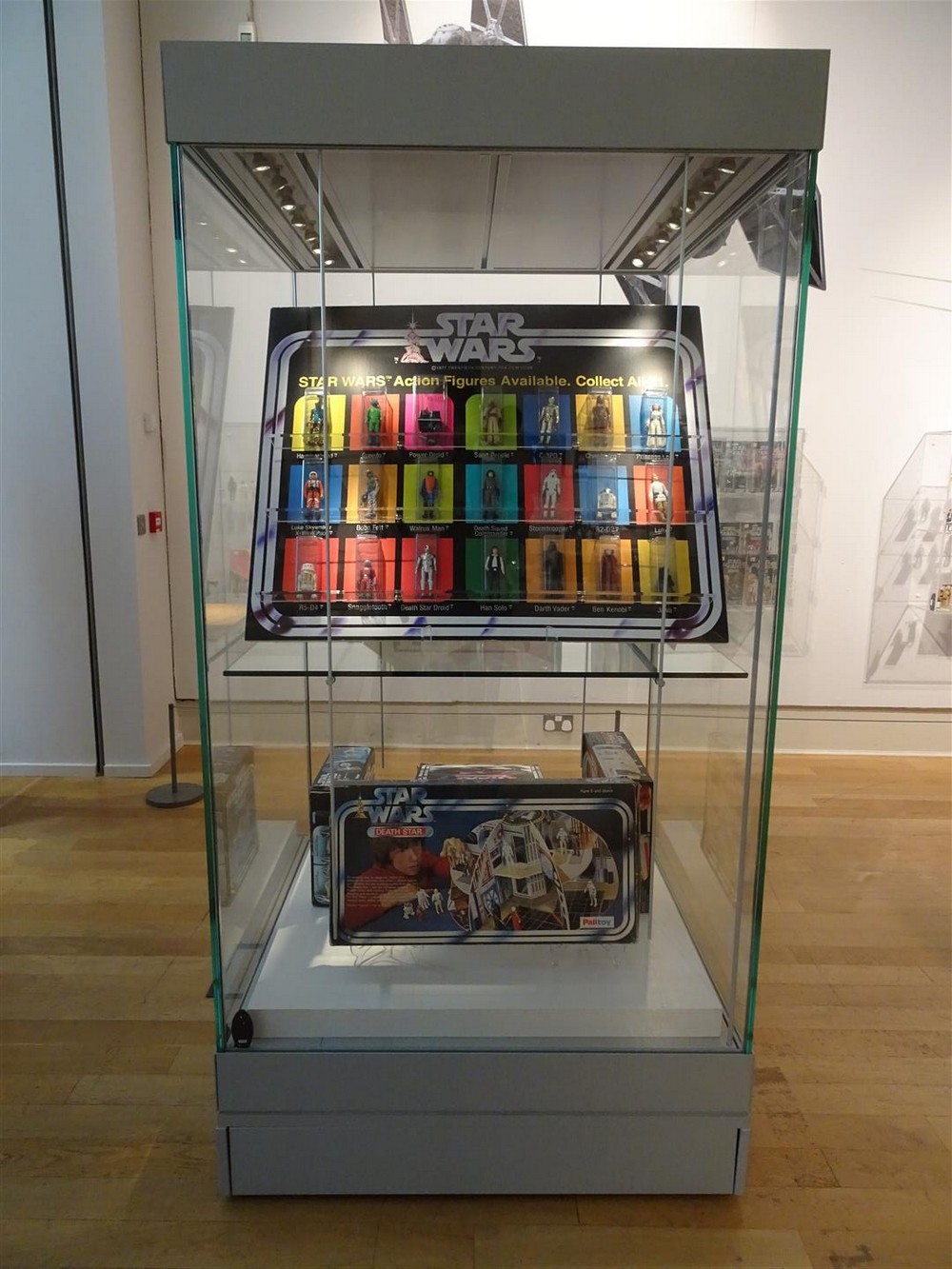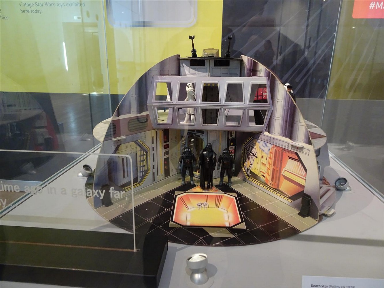 Stepping through the doors, the first item you will see is the rare Palitoy Death Star space station cardboard playset from 1987. This was designed and manufactured by Palitoy in the UK as an alternative to the more expensive plastic Death Star playset that Kenner were releasing in America. Behind this is a large information board giving an overview of the inception and history of Star Wars toys.