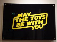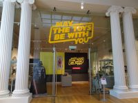 Heading upstairs to the exhibition entrance, which is an equally grand entrance with columns and glass doors featuring a large decal of the May The Toys Be With You logo.