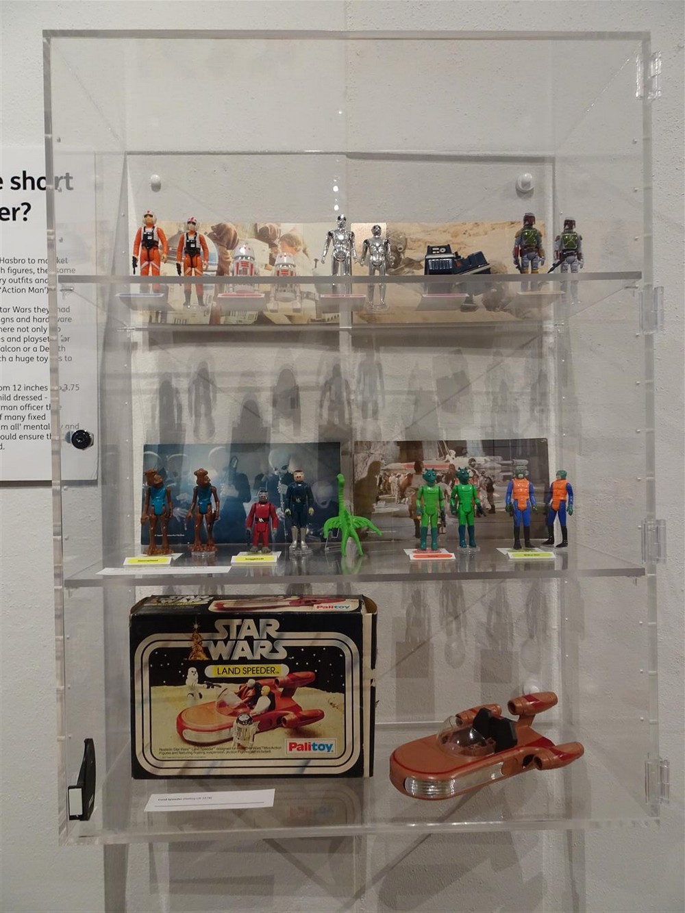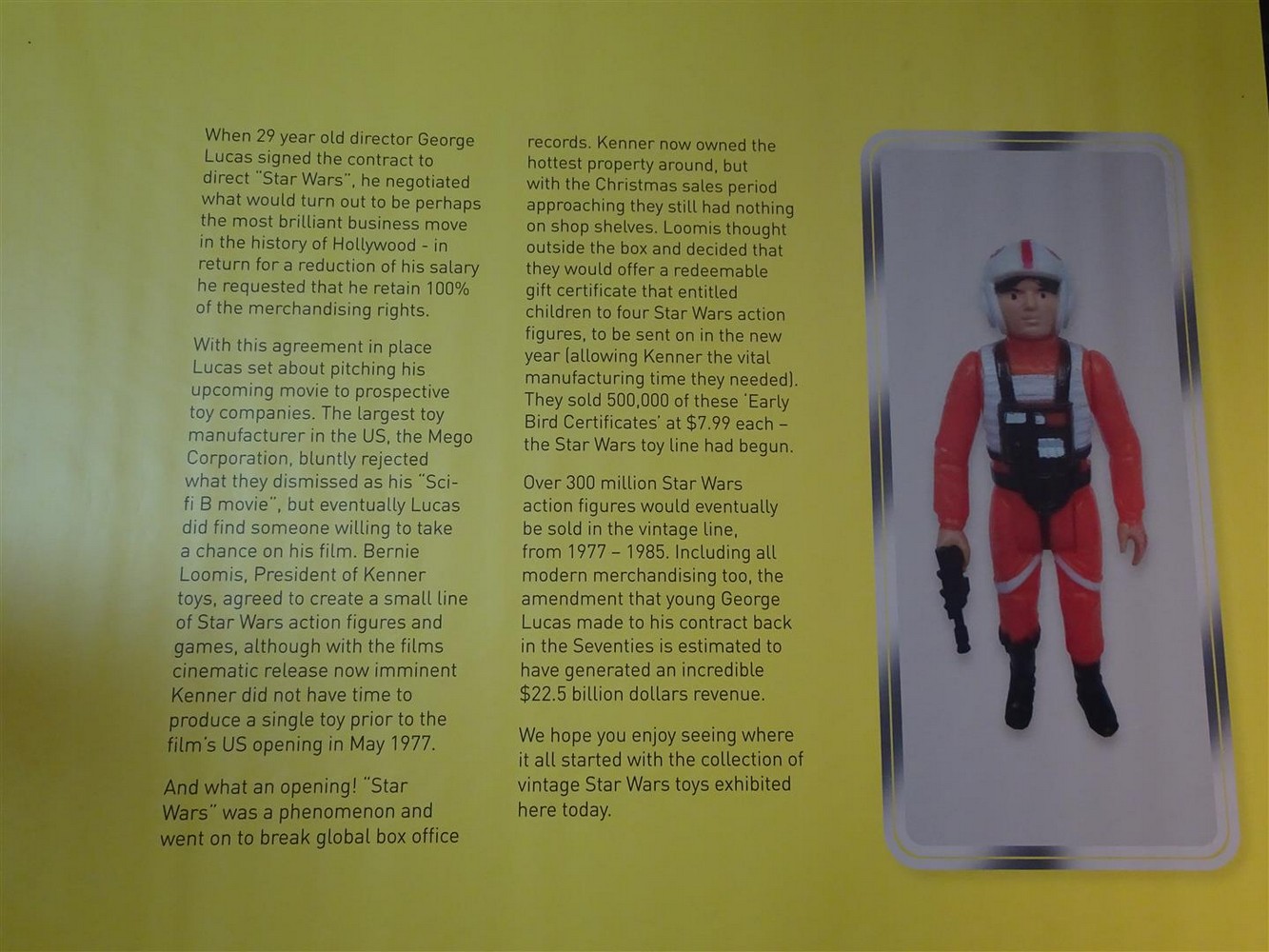 Moving to the left you’ll see where it all began with the rare Kenner Early Bird Certificate Package. As the information board explains, Kenner were unable to have product ready for Christmas 1977, so instead of having nothing of the shelves for Christmas they opted to sell Early Bird Certificates that entitled children to redeem four action figures when they’d been manufactured in the New Year. Kenner sold 500,000 of these certificates over that Christmas period.
