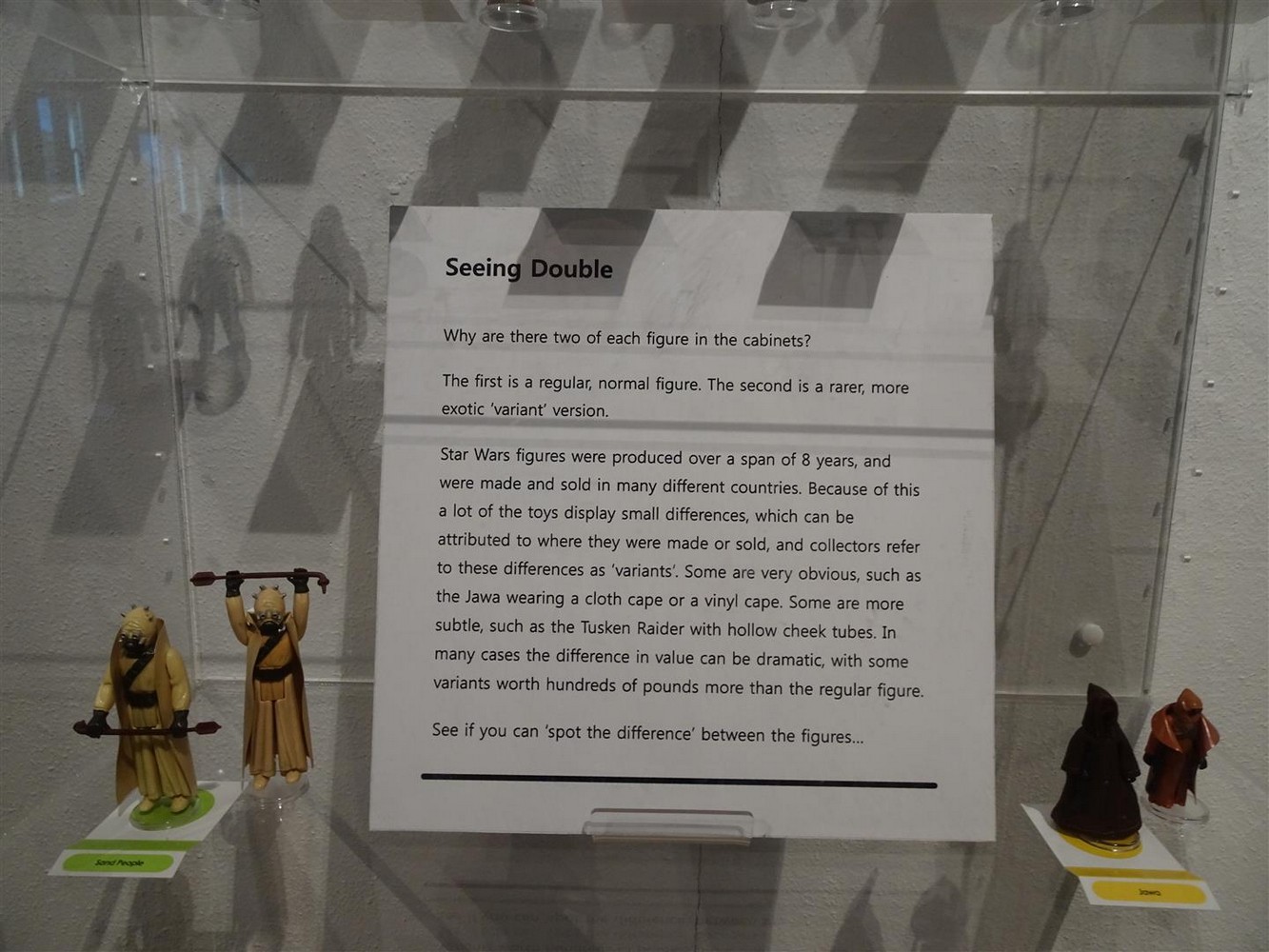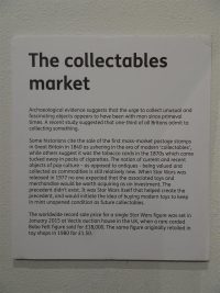 The information plaques next to each display case offer a wealth of information, including details and trivia on the history of the line (with particular focus on the UK), variants and foreign releases, collecting, the importance of condition and how it affects the value, and how to spot forgeries with a display demonstrating how many reproduction accessories will sink whereas the genuine accessories will float.