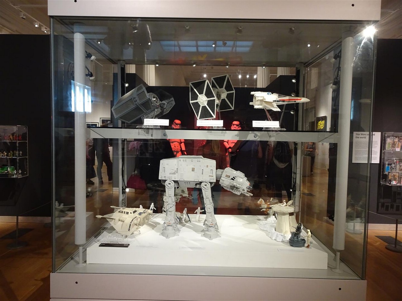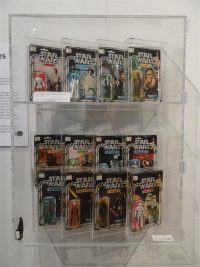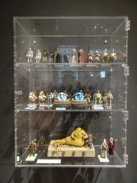 As you continue around the display cases you see the whole collection of loose figures as well as numerous carded figures, and boxed vehicles and playsets. Several of these I’m seeing in person for the first time, notable most of the famous ‘Last 17’ of which I only own 5 of and the Blue Snaggletooth that was exclusive to the US Cantina Adventure Playset. What I find remarkable is the ‘as new’ condition of the figures compared to the played with, sun faded condition my own childhood figures in my collection.