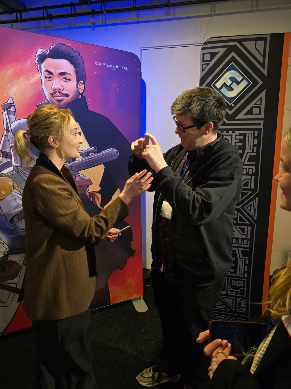 While we were aware that there would be a guest, I imagined that we would be meeting someone from Fantasy Flight Games, perhaps one of the designers or artists for A Lawless Time, so imagine our surprise when we were told that none other than Mon Mothma herself Genevieve O’Reilly would be visiting. For two hours she chatted with everyone in the room, giving us all plenty of time and attention, and even signing a Mon Mothma card for each of us. A genuine treat, and many thanks to Mark Alders for snapping the pics of myself and Genevieve.