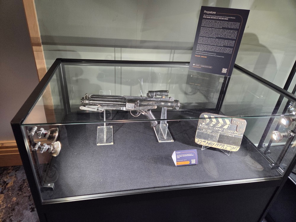 There’s a very famous missing hand in The Empire Strikes Back, and at the Entertainment Memorabilia Live Auction – London Winter 2025 you could buy two. With an estimate of £15,000 – £30,000 you can purchase the left and right hands of C-3PO (before he loses one of them in The Force Awakens), and if you’ve got £75,000 – £150,000 then maybe you can place the lightweight hero The Phantom Menace lightsaber of Ewan McGregor’s Obi-Wan Kenobi into his golden palm. To see the screen-matched, hand-painted Ralph McQuarrie Cloud City artwork was a genuine privilege, while the Luke Skywalker Force-Jump Puppet was intriguing, a modified Kenner 12″ Luke Skywalker action figure with brown tape used to make his costume (and a snip at £50,000 – £100,000). If you can stretch to £15,000 – £30,000 for another ‘Empire‘ item, the Second Unit Insert Clapperboard then perhaps the Hero Blank-Firing Imperial Stormtrooper E-11 Blaster Rifle with Original Dressing Components from Return of the Jedi (£100,000 – £200,000 estimate) is a possibility. Mind-blowing, grin-inducing stuff.