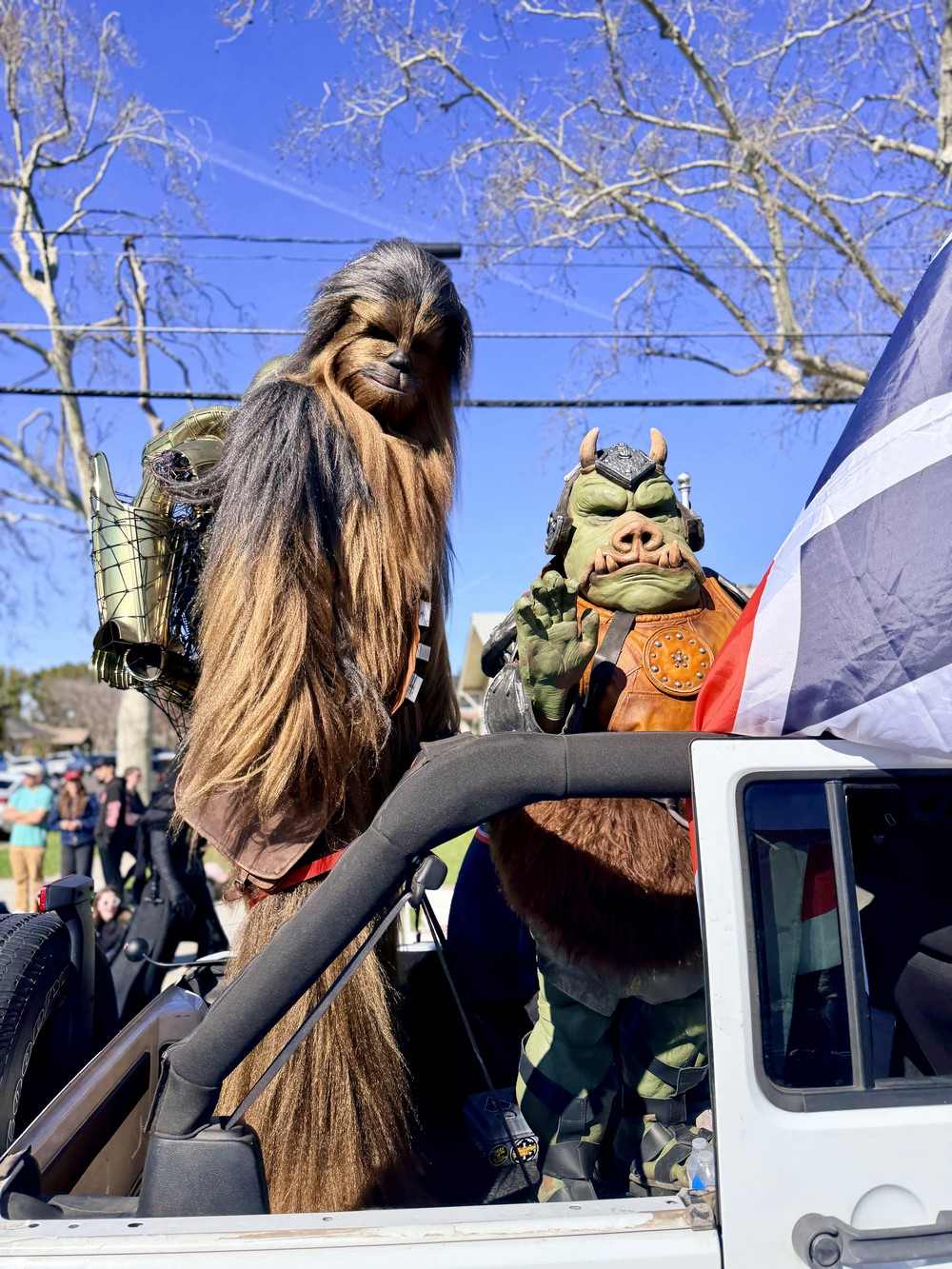 With more than 70 costumed participants walking the nearly mile-long (about 1.5-kilometer) route through downtown Ripon, the parade became a moving tapestry of galactic icons. Robed Jedi strode alongside armored troopers and other enforcers of the Empire as Darth Vader advanced with measured authority. Aliens, bounty hunters, and other familiar faces (and buckets) rounded out the formation. Atop a rolling truck stood a towering Gamorrean Guard, while Chewbacca carried C-3PO on his back. An R2 unit rode proudly on a trailing flatbed, drawing cheers at every turn.