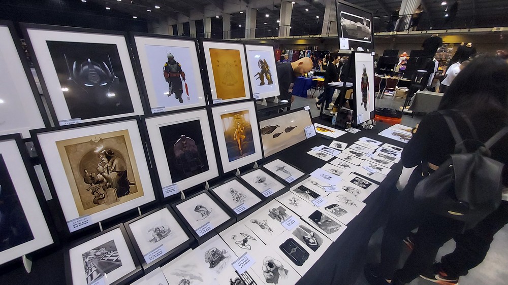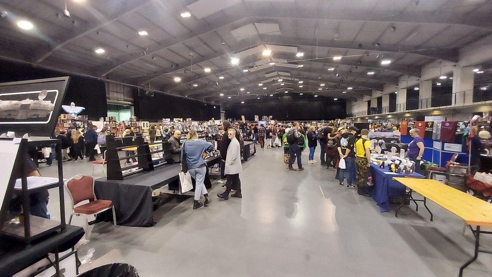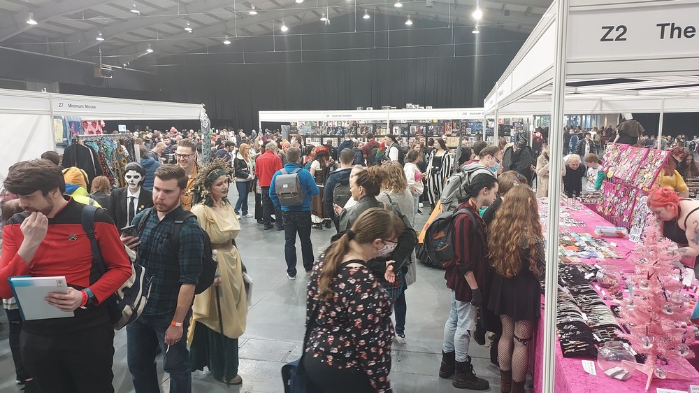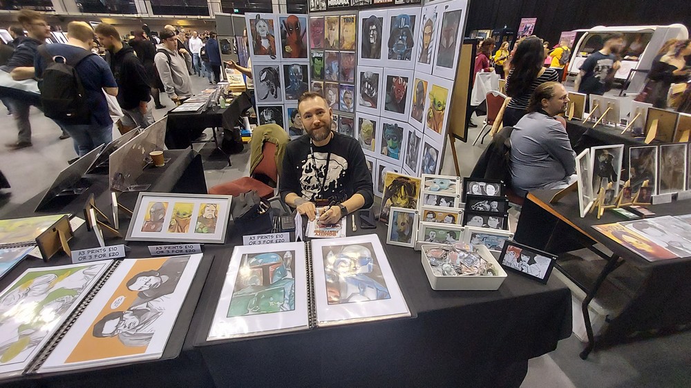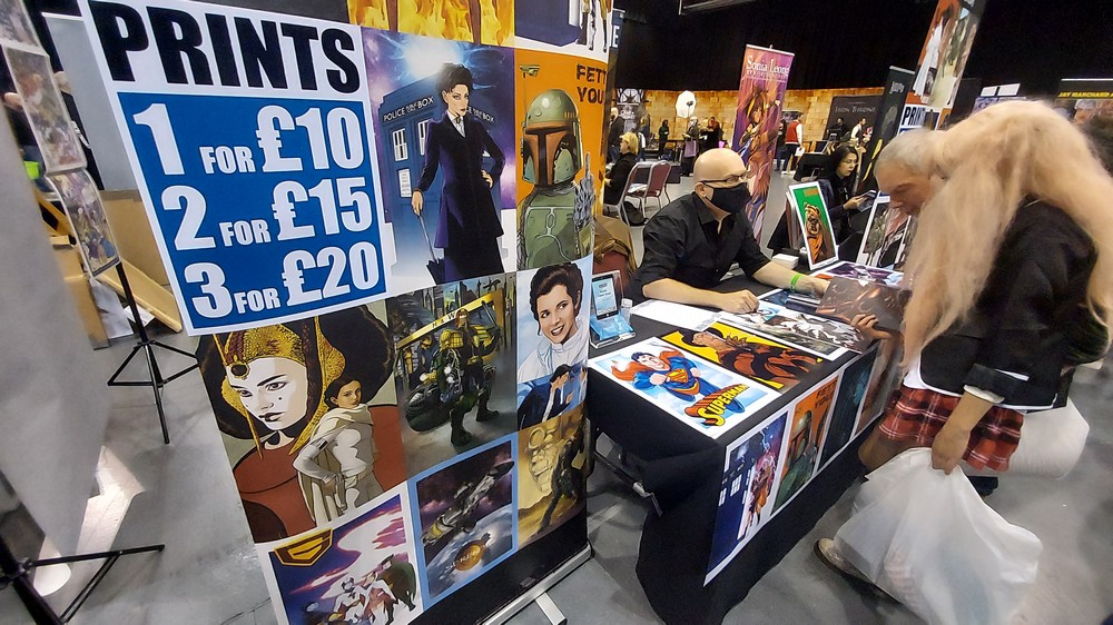 Carl Bayliss: Having been to the last pre-COVID ‘Wales Comic Con – Telford Takeover’ I was really looking forward to this one, and it was a great return to form. Spread over 3 ‘halls’ within the fantastic Telford International Centre there was lots to see and do (and buy!!!!) and loads of guests, for the most part grouped into their ‘franchise’ (so a Doctor Who section, a Star Wars section an so on). This latter point may seem a simple thing, but not all conventions group guests like this, but it makes sense especially for fans of a particular franchise who don’t have to go off searching for each guest. As you can see from the pictures, the halls were well spaced out, and meant that even at it’s busiest it didn’t feel over-crowded. Some of the artwork on show was amazing, from both new names to me and some of our old friends such as Jay Manchand and Gavin Lee-Pate (aka The Retro Draughtsman) – interviews with both will be coming to a podcast near you soon!