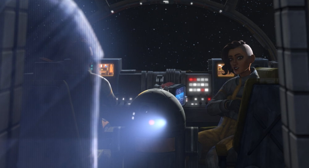 However, in the ensuing escape, the droid head gets destroyed by blaster fire. Luckily the programming was extracted beforehand. R7 is called to pick them up. Aboard Trace’s Silver Angel, Trace reveals that they needed the information from the droid to help fight back against the Empire. Looks like the sisters decided to take sides after their association with Ahsoka. Before they go their separate ways, Hunter gives the data rod to Rafa because he knows they’ll use it for the right reasons, proving that Clone Force 99 is different. In the last scene, we see Rafa and Trace in the cockpit of the Silver Angel. Rafa asks R7 to “patch him through.” A hologram appears. Of course, it’s a view from the back, and we only get to see a shoulder. Rafa tells the mysterious figure that they retrieved the data and had help from a group of rogue clones, and she knows where to find them.