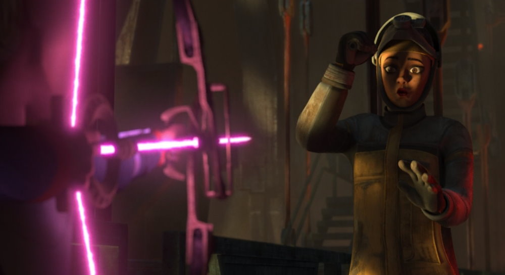 Wrecker eyes the competition, then Omega immediately gives chase only to be stopped by a factory worker. Omega bears her bow and arrow in defense. As the worker flips up her visor, my immediate reaction was, is that Rafa? Rafa and her sister Trace first appear in season 7 of The Clone Wars episodes 5-8. Fans have a divided view of Trace and Rafa. Either they love them, or they don’t. I appreciate their average Star Wars citizen point of view.