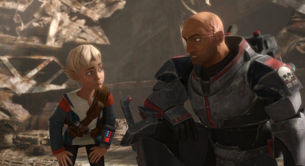 Cad Bane, being the cowboy bounty hunter he is, stands off western-style against Hunter. The showdown between these two is very reminiscent of the George Lucas days of Star Wars. It’s a nice touch by director Steward Lee and writer Christian Taylor and deserves a recognitional nod. Sadly, it doesn’t bode well for Hunter or Omega, even with Cad’s apology, “sorry, little lady,” as he blasts Hunter square in his chest plate and stuns little Omega before leaving with her in tow.