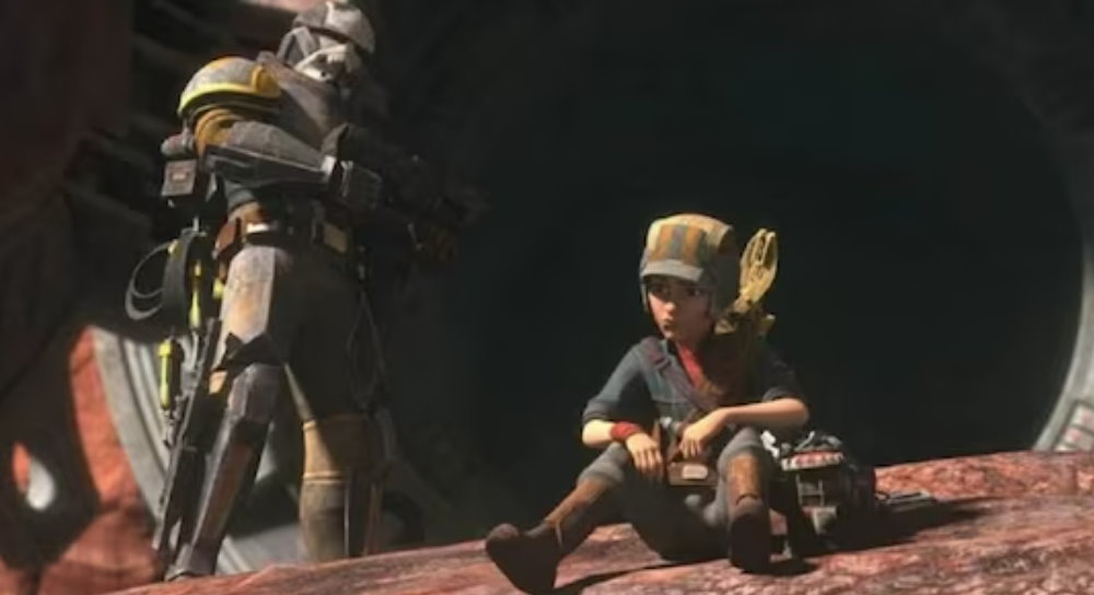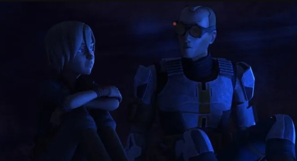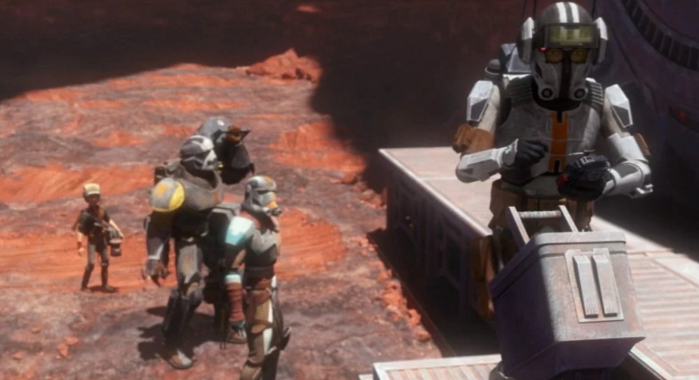 I know I’m not alone when I say that by far the most compelling scene in this episode was the one in which Omega and Tech have an extended heart-to-heart about dealing with the absence of Echo and, more recently, the Marauder — or as Omega says, their home. When Omega asks Tech if they’re a family, it forces him to think about their relationship differently. I don’t mean that he suddenly changed his mind and said, I once thought we were a squad, but now I think we’re a family. It’s more admitting to and acknowledging what he’s probably felt for some time but just failed to articulate in the way that Omega does in that moment.