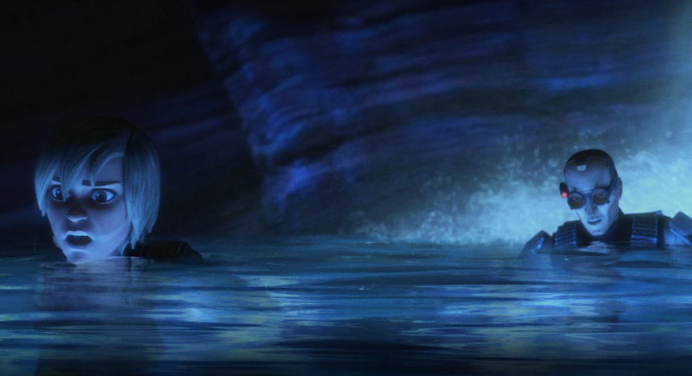 We’re out on a mission for Cid, this time looking for ipsium in an abandoned mine the tricksy Trandoshan has bought and despite the mission being seemingly simple and a bust, there are a few factors to consider. The terrible weather conditions which can tear anything to pieces being one, thieving starship thieves being another. While the older members of the batch understand Echo’s reasons for taking a mission with Rex and putting his efforts elsewhere, his absense has clearly opened a hole in the team, and with Wrecker taking his eye off the ball (by dropping his eyelids over them for a nap) and allowing the Marauder to be stolen, the tensions only rise as Tech and the tank of the team needle each other as Hunter tries to play referee and Omega sadly watches on.