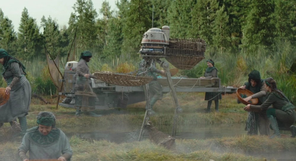Seen in the village, and throughout multiple episodes this season, are the long legged farmer droids that we also saw on Sorgan in The Mandalorian.