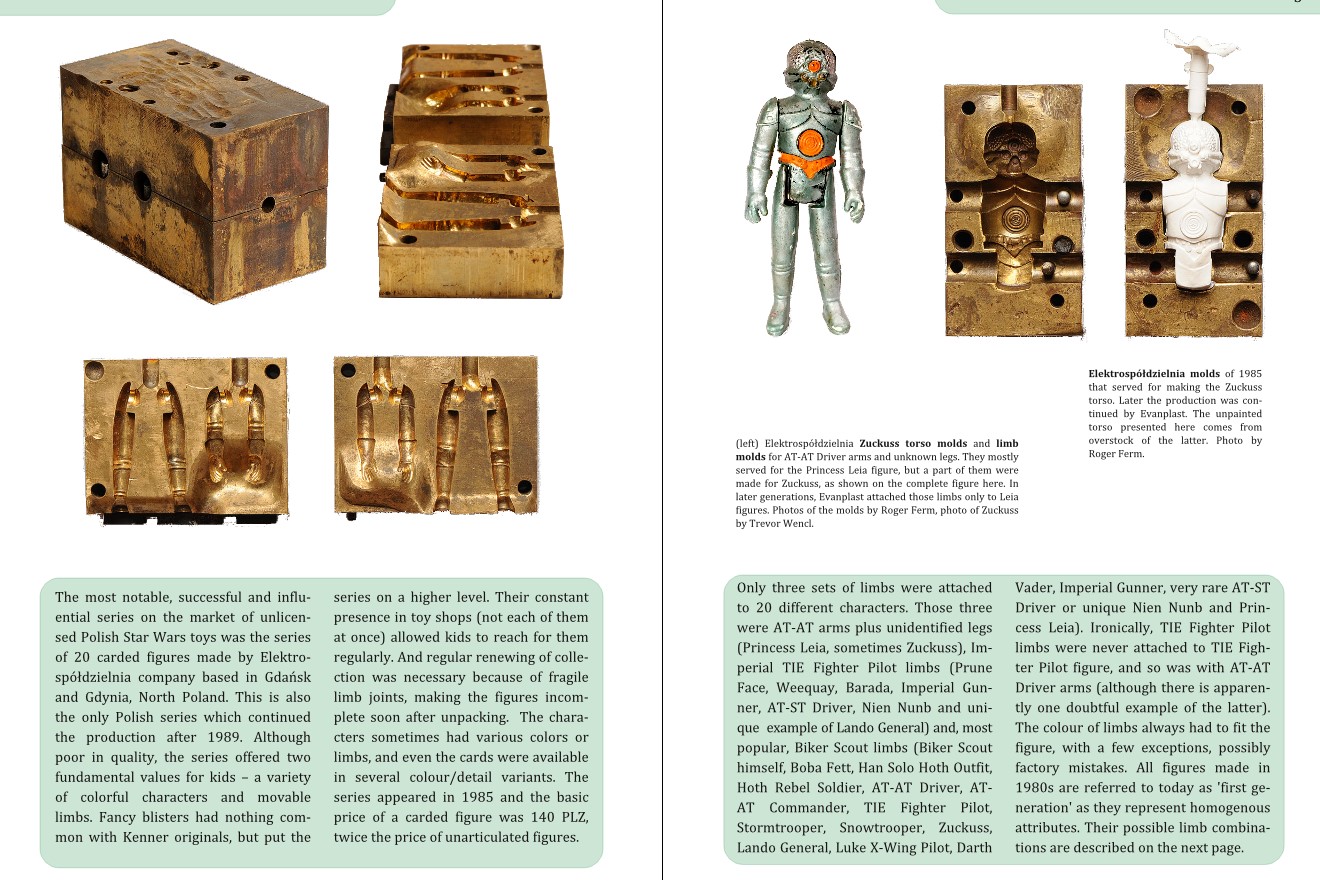 Among all those different collections, the Polish figures were probably the most prolific and colourful of all, with the largest number of variations -both in limbs and colors-, than any other. Jakub’s book is the first one ever published with a specific focus on those collections. It deliciously dissects the different factories that produced these toys in Poland (communist cooperatives), and includes hundreds of different top-quality pictures of the main variations known to collectors to this day. From bootleg lines that intended to get as close to Kenner’s work as possible, even with similar cardbacks; to others that took different shortcuts (due to their own limitations, in terms of manufacturing or profit wise) to the point of producing an entire line of 20 different figures (even Leia) that shared the articulated limbs of Kenner’s Biker Scout, or AT-AT Driver’s limbs; or even others who manufactured full sets of unarticulated figures (27 different figures in two different sets).