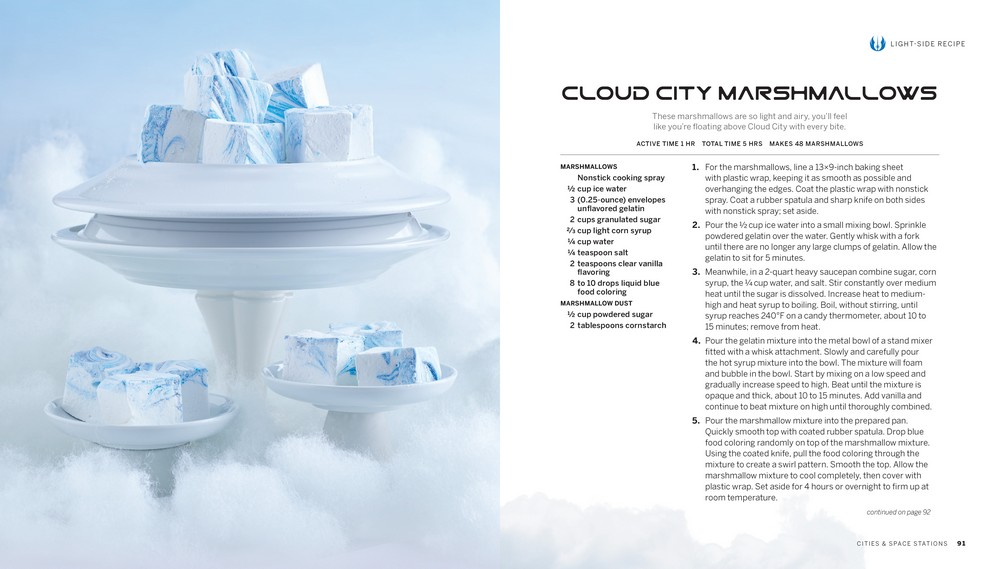 As with most cookery books, the recipies are broken down into logical portions. There are Dessert Worlds, Frozen Worlds, Green Worlds, Cities and Space Stations and Swamp, Volcano and Mineral Worlds, separated into three different types of dish; Lightspeed recipies that take anything up to 30 minutes, the rich and indulgent Dark Side recipies and low calorie, healthy Light Side recipies. It even gives you a list of the best bakery tools to use (sadly no hydrospanners are required). Get all of those and an empty kitchen and you’re away.