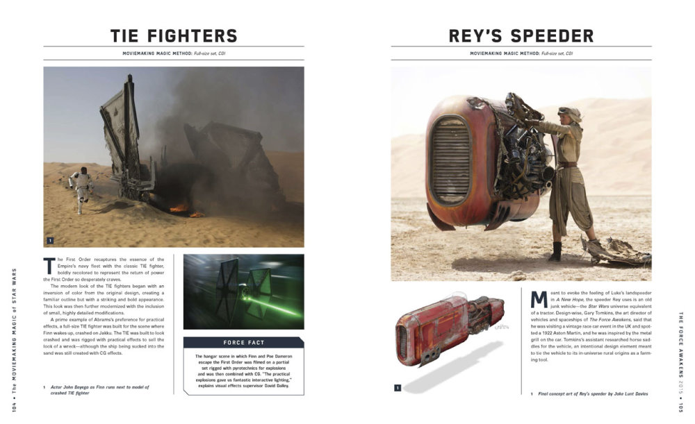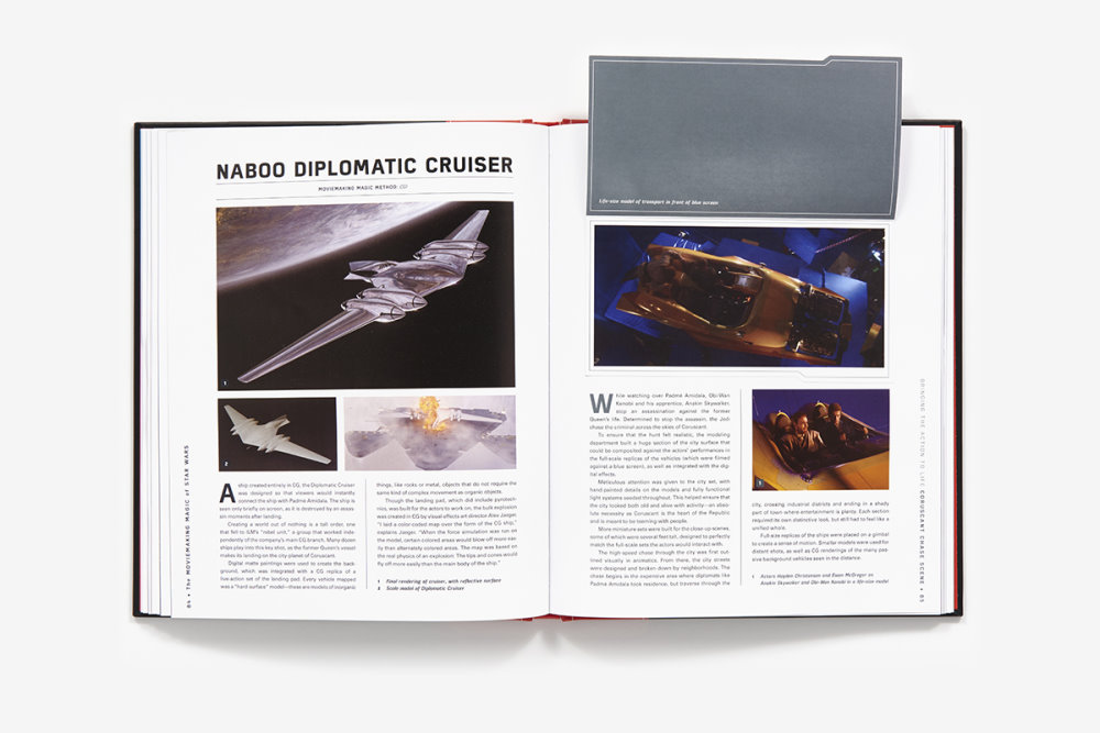 That’s not all. If this were a classic informational book it would be enough – the design is crisp, clean and pleasing on the eye with pre-production sketches and behind the scenes images littering the pages – but The Moviemaking Magic of Star Wars: Ships and Battles has another ace up its sleeve. Each ship has a mini file, pages showing the ship onscreen, it’s model being shot or on set images or sketches, making an already pleasurable read a more interactive journey.