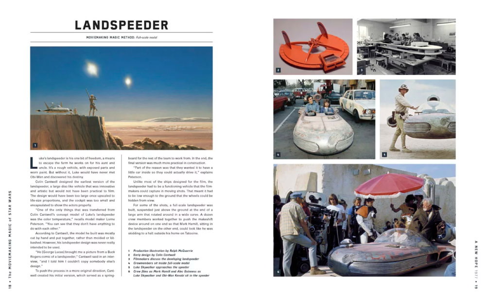 It really is a fun read as we move through the events of the original 1977 film, and there are rarely seen images to accompany the information. The Escape Pods page shows us the making of the model, shots from the film itself as well as images of Stormtroopers next to the location model while the landspeeder highlights the original Colin Cantwell design (similar colour, very different circular design).