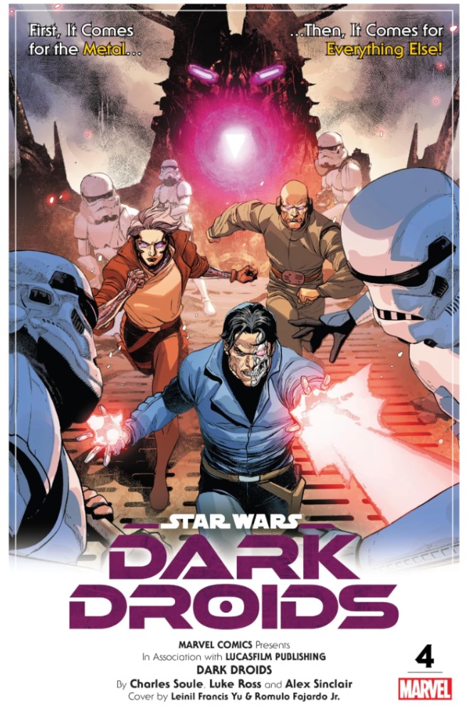 We head to Epikonia, where Lobot, Valance and Magna Tolvan attempt to get past a duo of Stormtroopers, but when it’s clear they won’t get past, they end them. Their plan is to send a message across the galaxy to co-opt droids remotely, and initiate a local test which works to incredible effect as the droids turn on the biologicals in the township, attacking without pause and taking many of them away to be experimented upon. The prime is advised they stay, even though the Empire will undoubtedly be following to quell the threat and destroy the city, but the droid ships need to be protected. Here, the ‘child’ droid has a question regarding the droid attack force that attacked them, but the prime knows full well what that is – the colony of the second revelation, who we turn to as Ajax prepares to put the final parts into a droid that he believes will awaken ‘visioned’, but pauses and throws the piece away. Even Ajax has doubts, but turns to see none other than R2-D2 there, who has with him 000, BT-1, IG-88, 4-LOM and QT-KT. Ajax realises that these droids understand his vision, and are ready to fight. With that, he agrees to join them.
