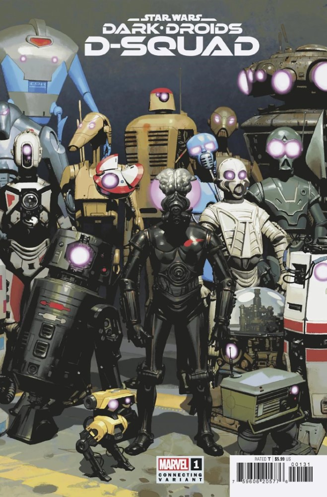 Opening any comic with R2-D2 has to be considered a winning move, but to see him tumbling aimlessly through space, not so much. That’s where we start the opening issue of Dark Droids: D-Squad as Artoo, who was ejected from Home One in Dark Droids #2 by a controlled C-3PO, tries first to communicate with friends, only to find his antennae are damaged, then to try his jets (which in true original trilogy form are missing) and finally to activate his fire supressant system which we saw in The Empire Strikes Back which jets him off at great speed right into an asteroid field. he bashes from rock to rock until he finds a starship hidden in the field and uses his magnetic grappling hook to connect to the ship and pull himself inside.