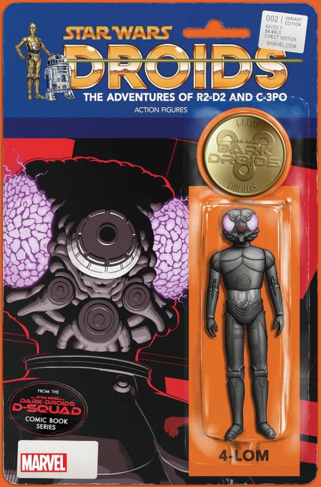 000 is reminded of his pledge to help Artoo with the ‘Threepio problem’ when none other than IG-88 enters the room, there to collect the bounty on both 000 and BT-1. BeeTee reminds Artoo he can’t help him rescue Threepio if he’s captured, and Artoo causes enough of a distraction for BeeTee to attack IG-88, only for the murder droid to be blasted by the bounting hunting droid. Artoo is given little choice in helping IG-88, and as they leave with the two droids dragged along they are stopped in their tracks by 4-LOM, who has no interest in co-opting IG-88’s bounty on 000 and BT-1 but in taking Artoo. We roll out as the cyborg who was battling BT-1 earlier arrives, guns in hand to end another interesting issue.