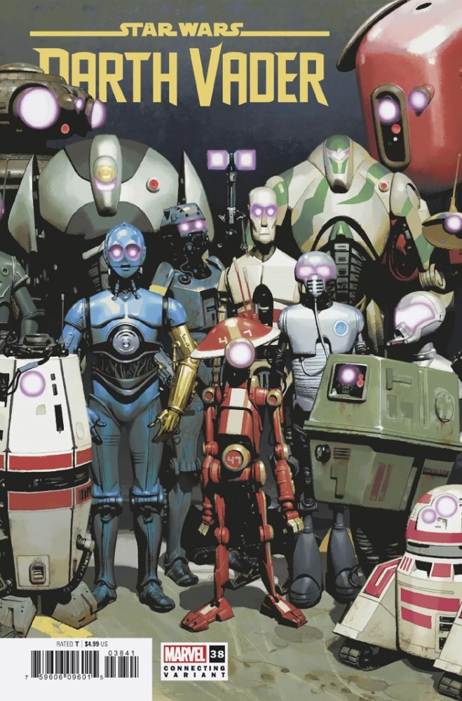 The Dark Droids storyline continues in issue #38 of Darth Vader as the dark lord battles an endless army of droids while his loyal droids Zed and Ought-Six work to disable the droids that have swamped the Executor. The comm buzzes and it’s Admiral Piett, who informs Vader that a fleet of Star destroyers have dropped out of hyperspace in attack formation, and with their comms disabled beyond the ship they have no way to contact them. Vader is unmoved as he continues to fight with the Zaly Shield, and we see Piett order power to the shields and to brace for impact, but a fortunate quirk of fate sees the commander of the lead ISD Admiral Corleque pause. He’s there to destroy the ship, and in turn Vader, but out of respect to his former commander Piett he opts to hold. He plans to rescue Piett, and then Vader can die, and so he sends rescue ships. Communications down, they use a flag system to warn them away and to beware their droids, but as the flag bearers are taken down by droid attackers the incoming ships decide to ‘clean up the mess’ with their own droids, who are quickly subverted by the roaming mouse droids who are deploying the scourge from droid to droid.