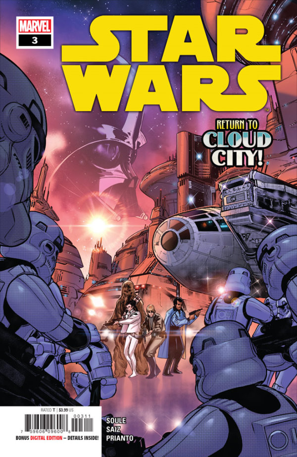 This is a mighty attractive comic to read through, with design and execution top notch, evoking Marvel of old while being presented in a contemporary fashion. The colours pop, while the script zips our characters around Cloud City on their individual tasks. Bespin is always a great location and while the first 3 issues have already seen us head to Bespin and Tatooine, the way this issue is drafted more than makes up for that. Luke wanting his father’s saber makes sense – his Jedi training isn’t to the point where he could consider making his own replacement yet, and Leia wanting to keep Lando in her sights also rings true. As for Calrissian, naturally he’d want to get back to Bespin and his city, and again harkening back to the classic ’81 era, Cloud City kicks back hard.
