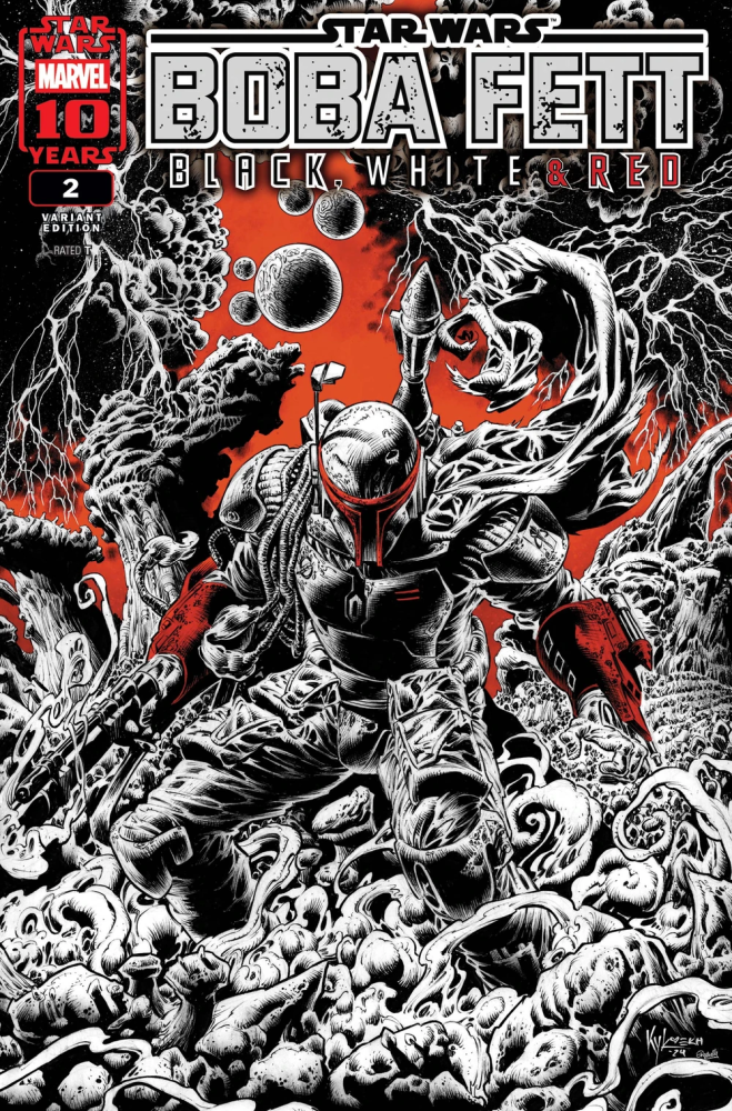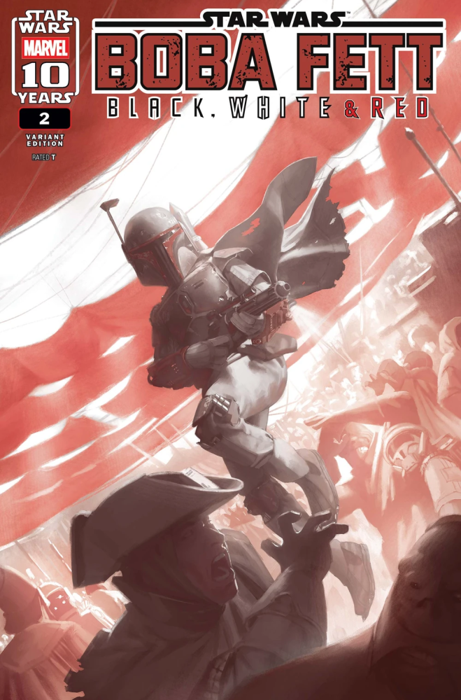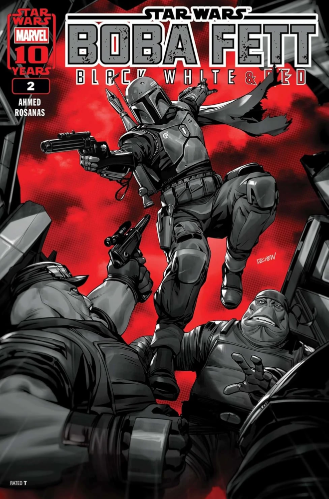What an absolutely belting issue of Black, White & Red this was, showing the cunning and skill of Fett while also placing in front of him a decision and choice that allows for a sliver of humanity. Yes, there will always be the shadow of his ‘father’s’ death lingering over him, and in circumstances like this that shadow must cast long, but it doesn’t entirely cloud his professional judgement. To the outside world we only see the completion of a bounty, another quarry hunted down, but watching from close-up like this we see the choices laid out and a decision not to tear apart another family for no good reason when there’s a second option available. There’s no doubt he’s the man when it comes to bounty hunting in this era (you’d have to imagine a prime Boba Fett versus a prime Din Djarin would only end one way) but stories like this allow us beneath the helmet, and when crafted so skillfully they enhance that reputation while also giving us a look at shards of a future that were denied to the young clone.