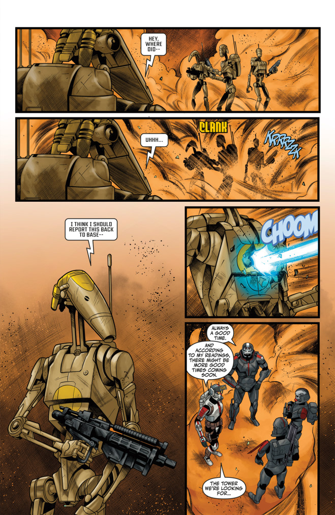 Moving through the sandstorm they spot the shadowy outlines of Battle Droids, and we watch as a gleeful Wrecker and his clone brothers take them down, turning around to find the towering installation, their target location. Now knowing there’s no other option, they gird themselves and pile in, blasting their way through the throng of Battle Droids as they attack, and we’re treated to a pacey and high-octane action scene as the droids are dispatched and we finally see the ghost agent, still very much undercover as he tells them they’ve made a huge error….until Hunter tells him about the list and how it’s been compromised. As soon as the ghost agent realises Aurra Sing is on his tail he turns to the nearest Super Battle Droid and ends it, prompting Hunter to reiterate how quickly they need to move, only for Aurra to drop through the glass ceiling.