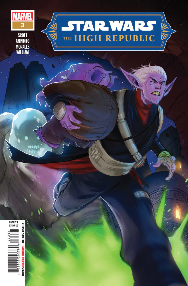 An observation as we dive into the third issue of The High Republic phase 2; whatever the era, the Jedi never seem to have it easy. In the dawn of the Jedi era as they find their place in the Force they have distinct challenges, as they do later in the war-fraught era of the Old Republic. The prequel era saw their decline, the civil war their isolation and the sequel era their resurgence, but as we continue to explore this area of the High Republic, the observation holds. We rejoin Vildar Mac, Matty Cathley and trickster Tey Sirrek inside the Temple of the Kyber, surrounded by Guardians of the Whills who are all aiming their lightbows at Sirrek. As Mac stops a potential escalation of tensions we learn that Sirrek was once a Guardian himself, and as he ponders on the situation we step back half a decade further into the past and a younger Tey as he rumbles a street robbery, losing the two young thieves as their droid blinds tey with a light flash.