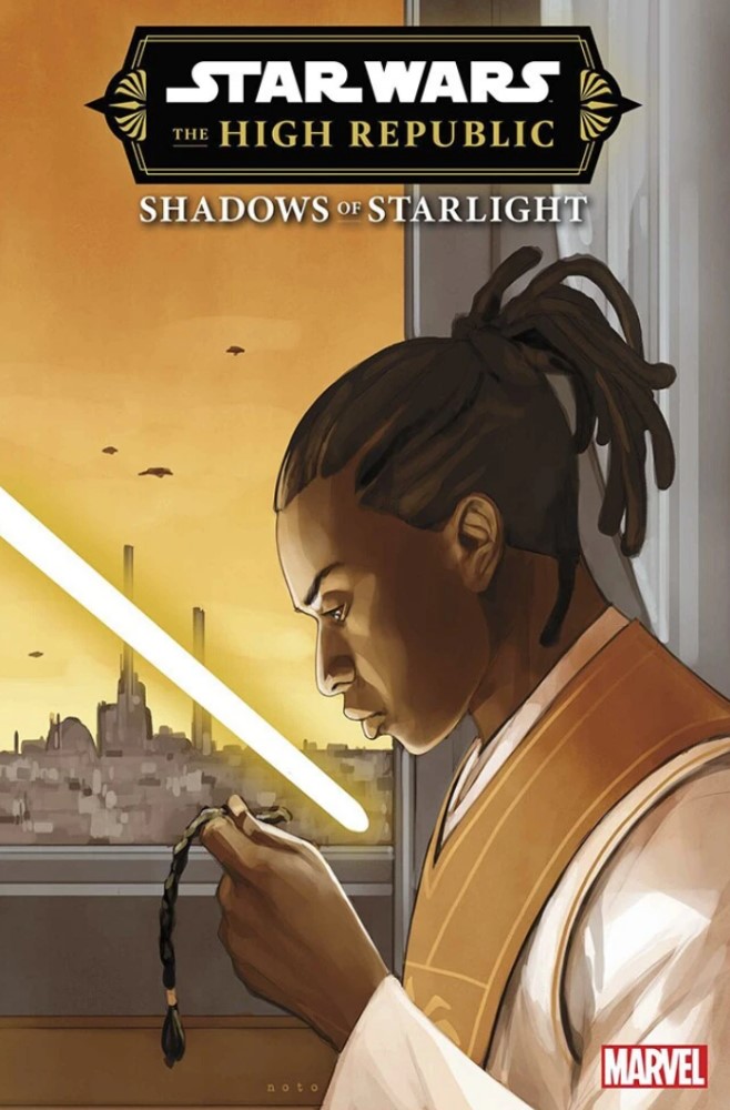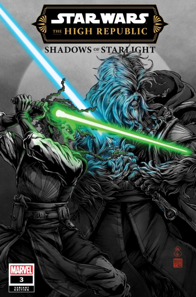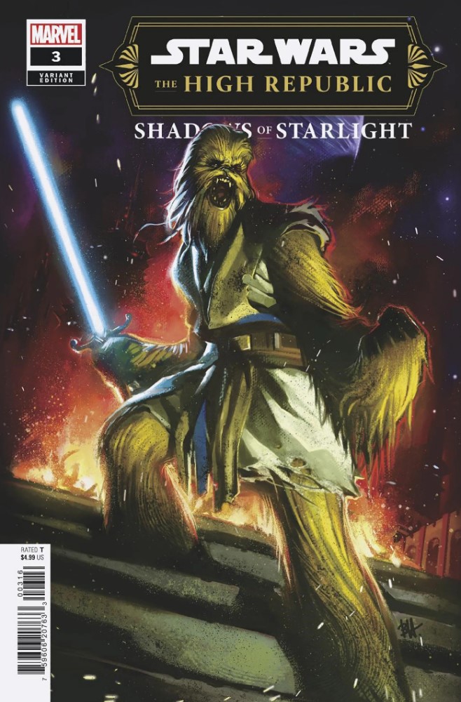 The first two issues of Shadows of Starlight moved at a clip, and the third issue is no different as we join old friends – Bell Zettifar and Elzar Mann – as they stand on the shores of Eiram, staring at the wreckage of the downed Starlight Beacon 5 days after its fall, the order for the Jedi to return to Coruscant bothering Bell as he stands determined to find his lost friend the wookiee padawan Burryaga. Elzar believes the wookiee to be gone, but Bell has to believe he is alive, and so as Elzar returns to Coruscant as requested and hands Burryaga’s lightsaber to the padawan, Bell follows his own path and stays, finding the long-lost wookiee on the very next page (read the Tales of Light and Life anthology for how he was found) and telling his friend how he plans to go back to Coruscant to help make the Nihil pay.