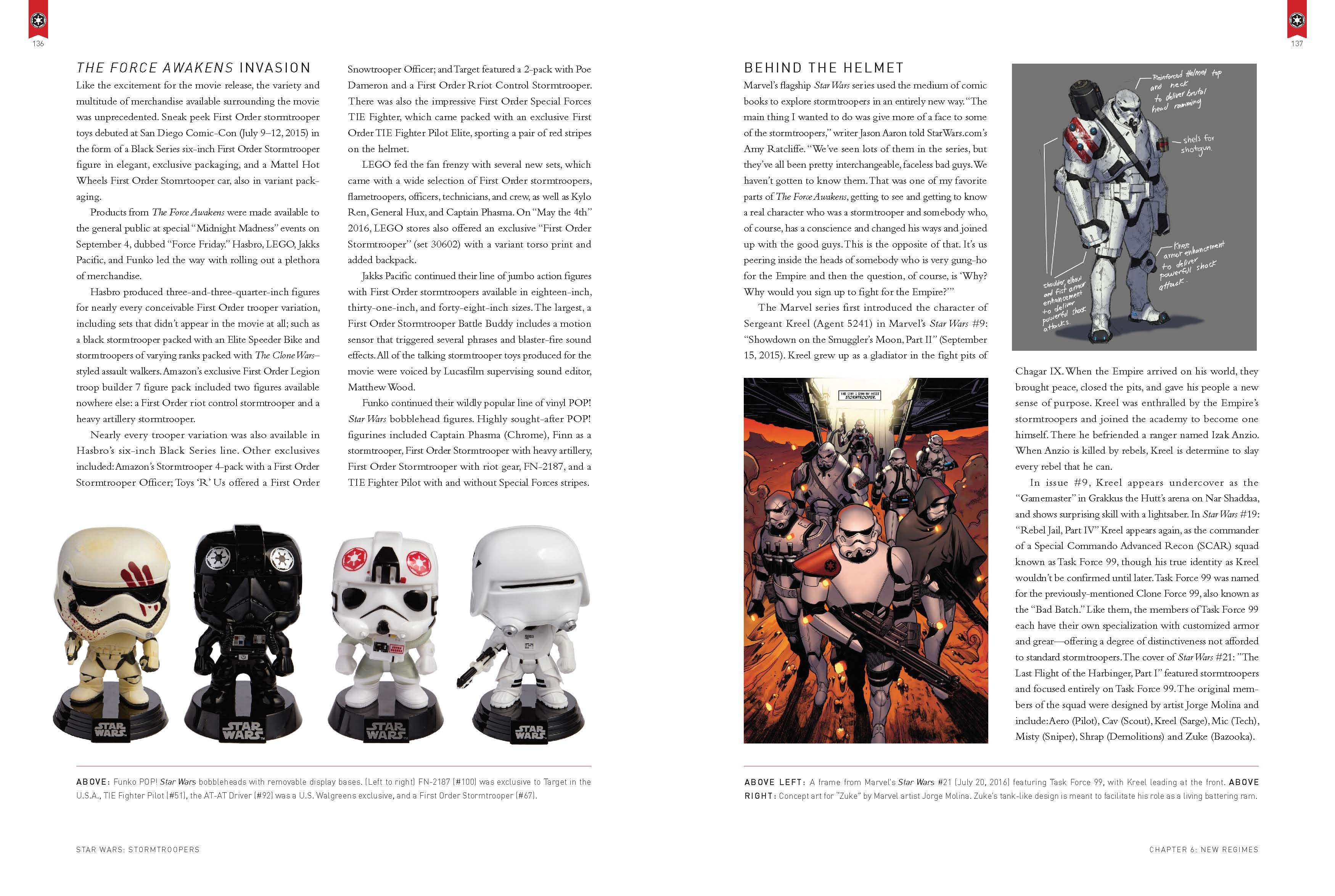 Kicking off with a forward by none other than the sequel trilogies most enthusiastic former Stormtrooper John Boyega, the book works its way through seven chapters that look at different eras and focuses of the Stormtrooper. The first chapter looks at the earliest, pre-A New Hope days of 1976 to 1979 and the very first trooper merch which included most prominently the classic action figures. What investigation of the era would be complete without a look at the now 39 year old Star Wars Holiday Special? Stormtroopers: Beyond The Armor dives deep, and treats every topic with the respect or brevity it deserves.